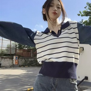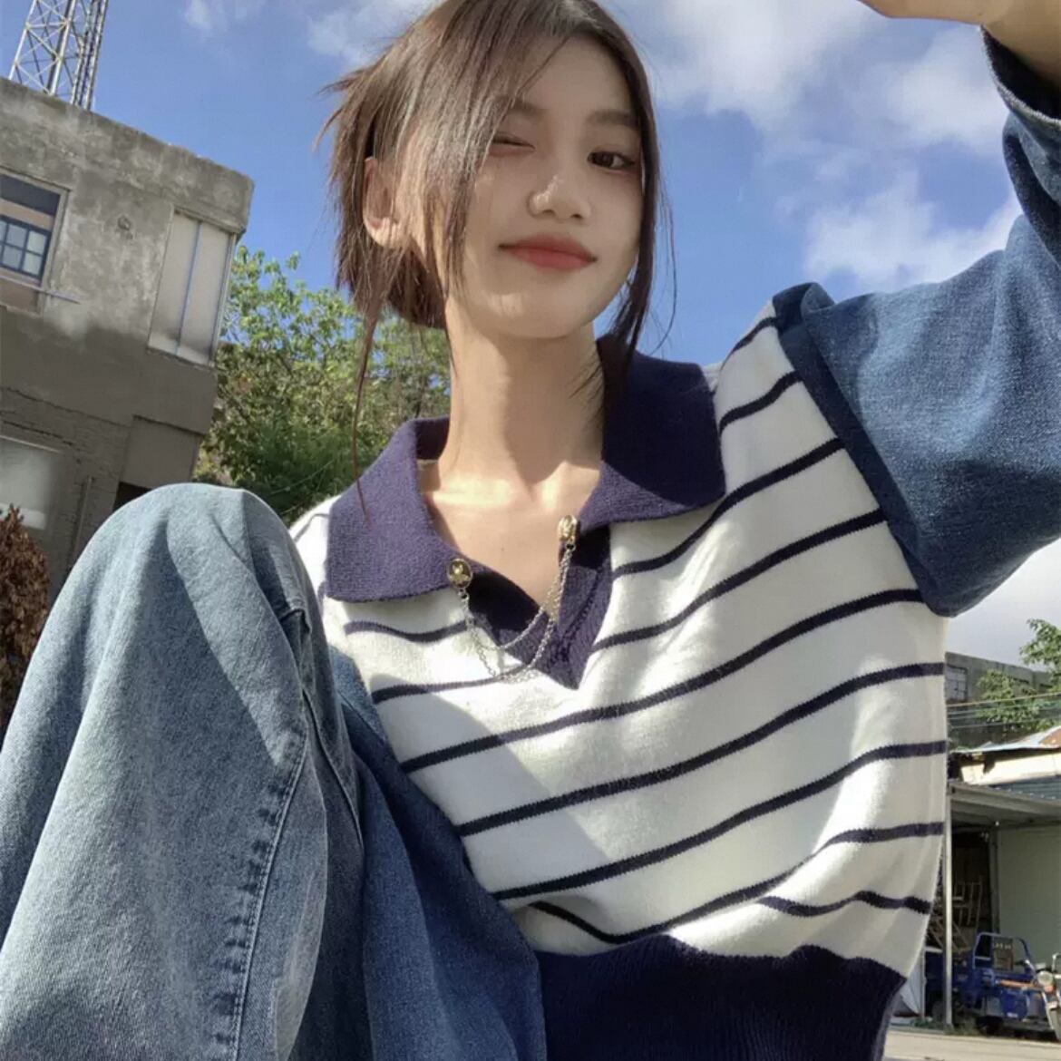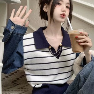 ボーダー柄のセーターとデニム生地との切り替えがお洒落♡