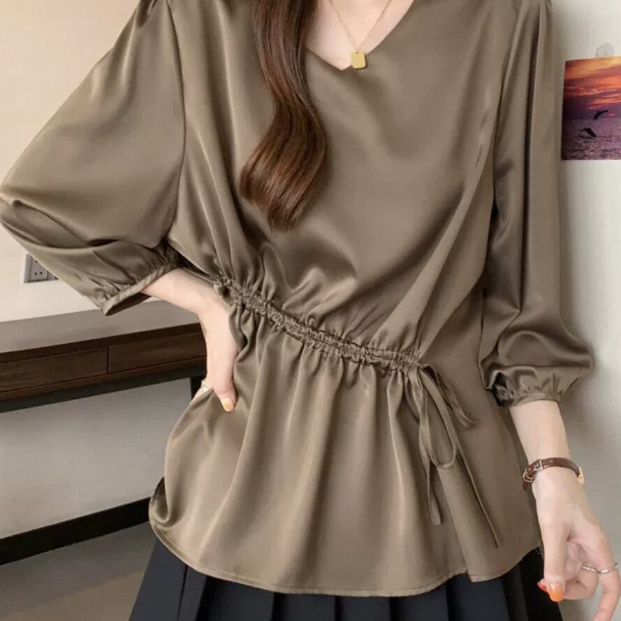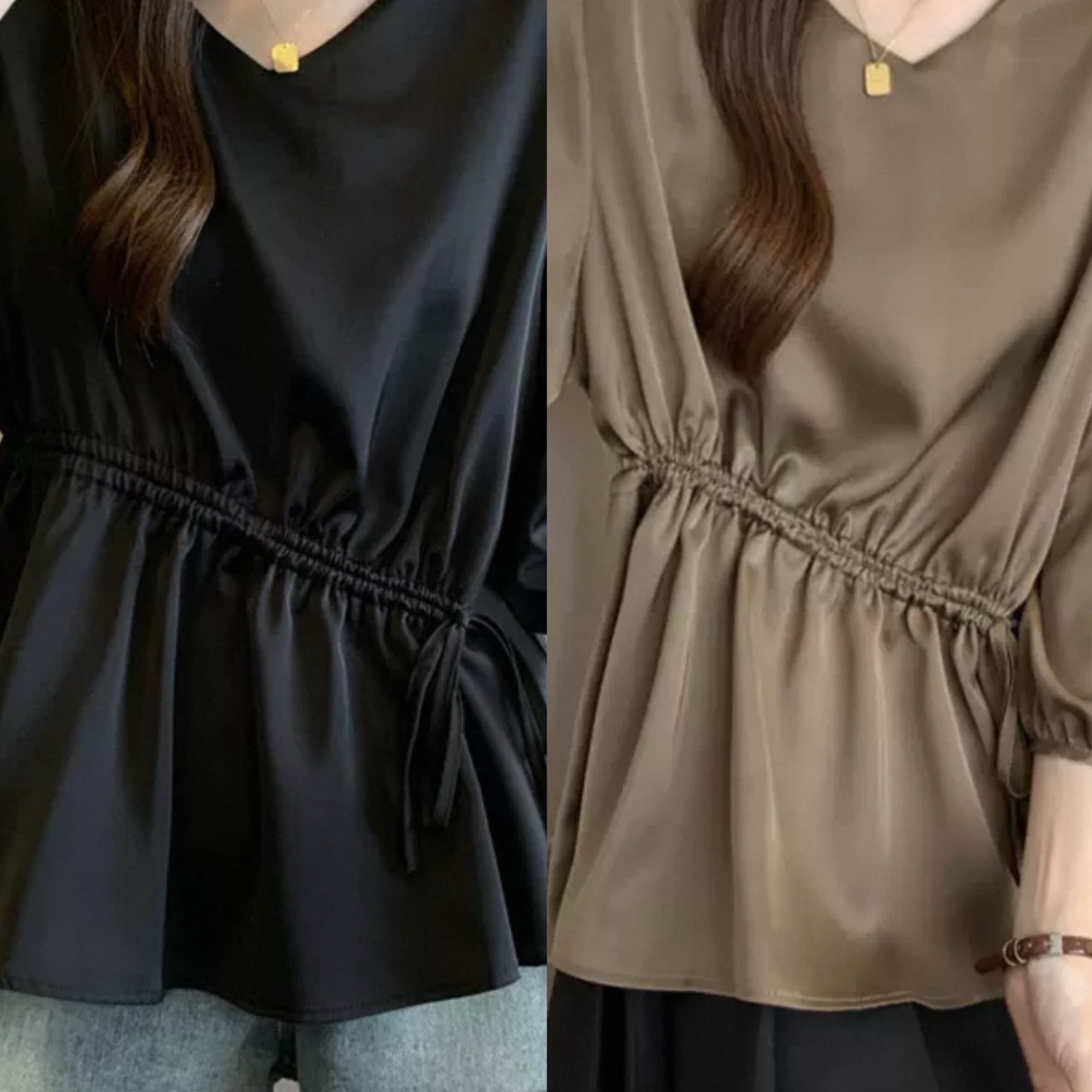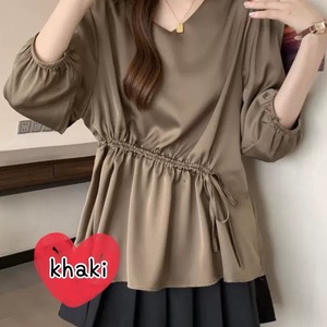 ウエスト部分のくしゅくしゅ感が特徴的な半袖ブラウスです