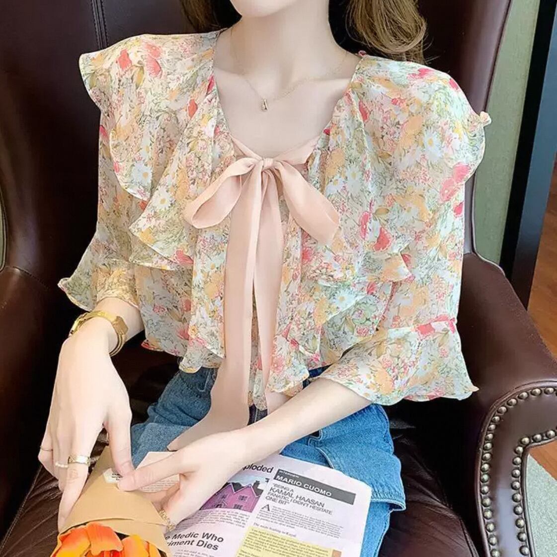大きめフリル可愛いボウタイブラウスです