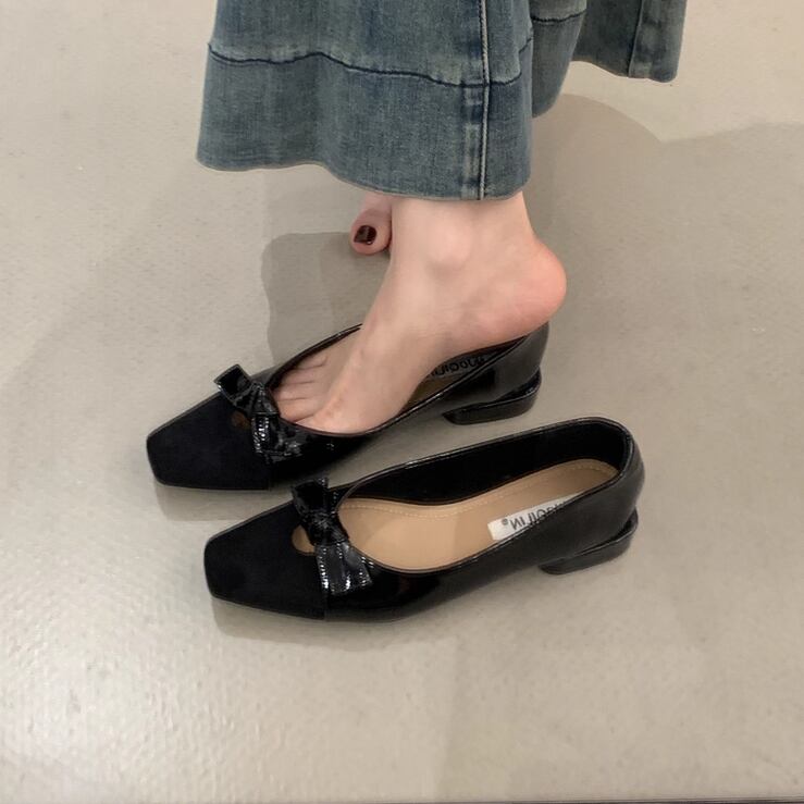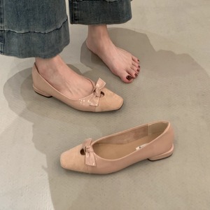 スクエアトゥと飾りリボンが特徴で、シンプルながらも華やかさを持ち合わせています。