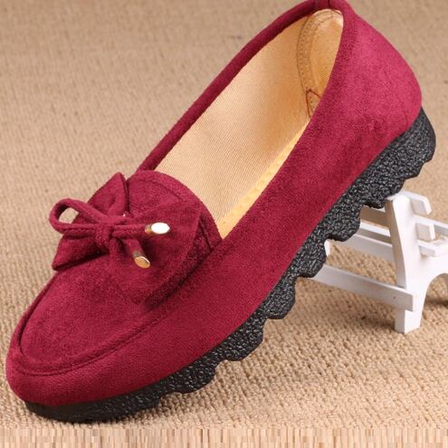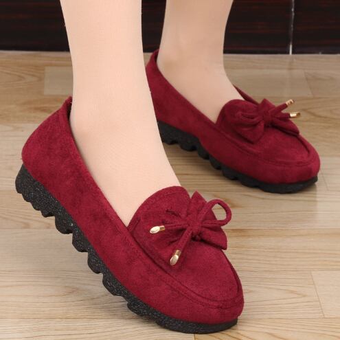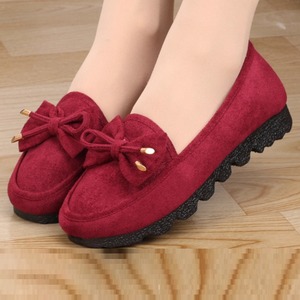スリッポンデザインとラウンドトゥ、飾りリボンが特徴で、シンプルながらも華やかさを持ち合わせています。