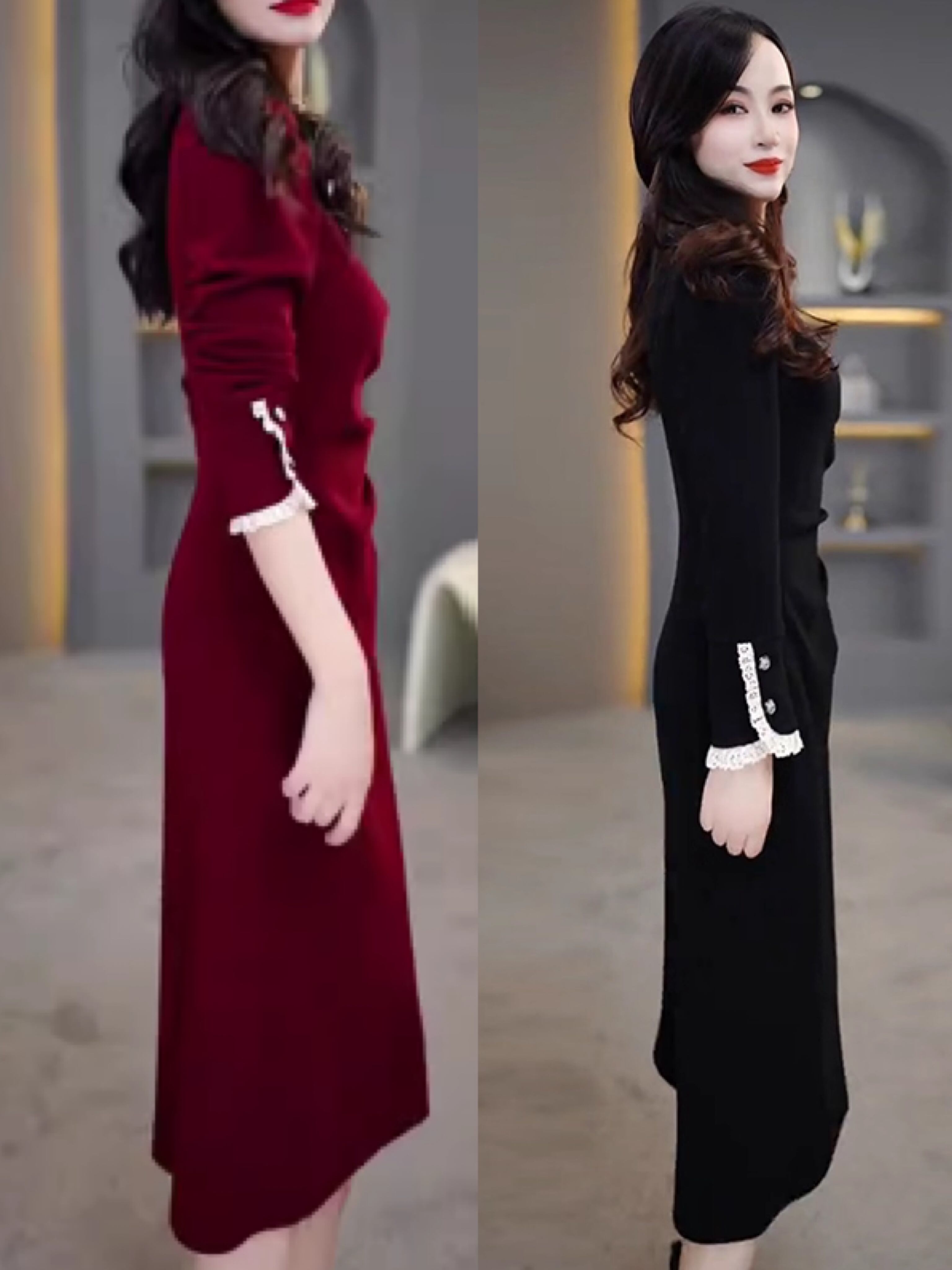 優雅なフリルとエレガントなAラインが、女性らしさを引き立てるミモレ丈のカラードレスです。