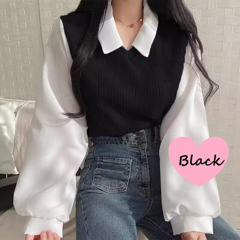 レイヤード風デザインのニットセーターです。