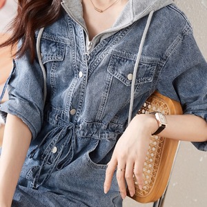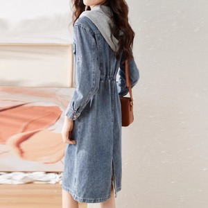 デニムとフード付きパーカーの重ね着ワンピです