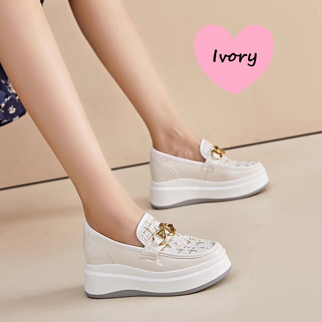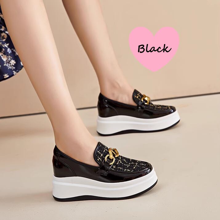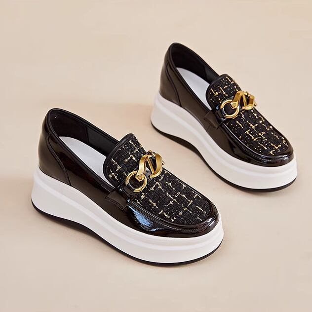 丸トゥの優しいシルエットと飾りチェーンがアクセントとなり、シンプルながらも華やかな印象を与えます。
