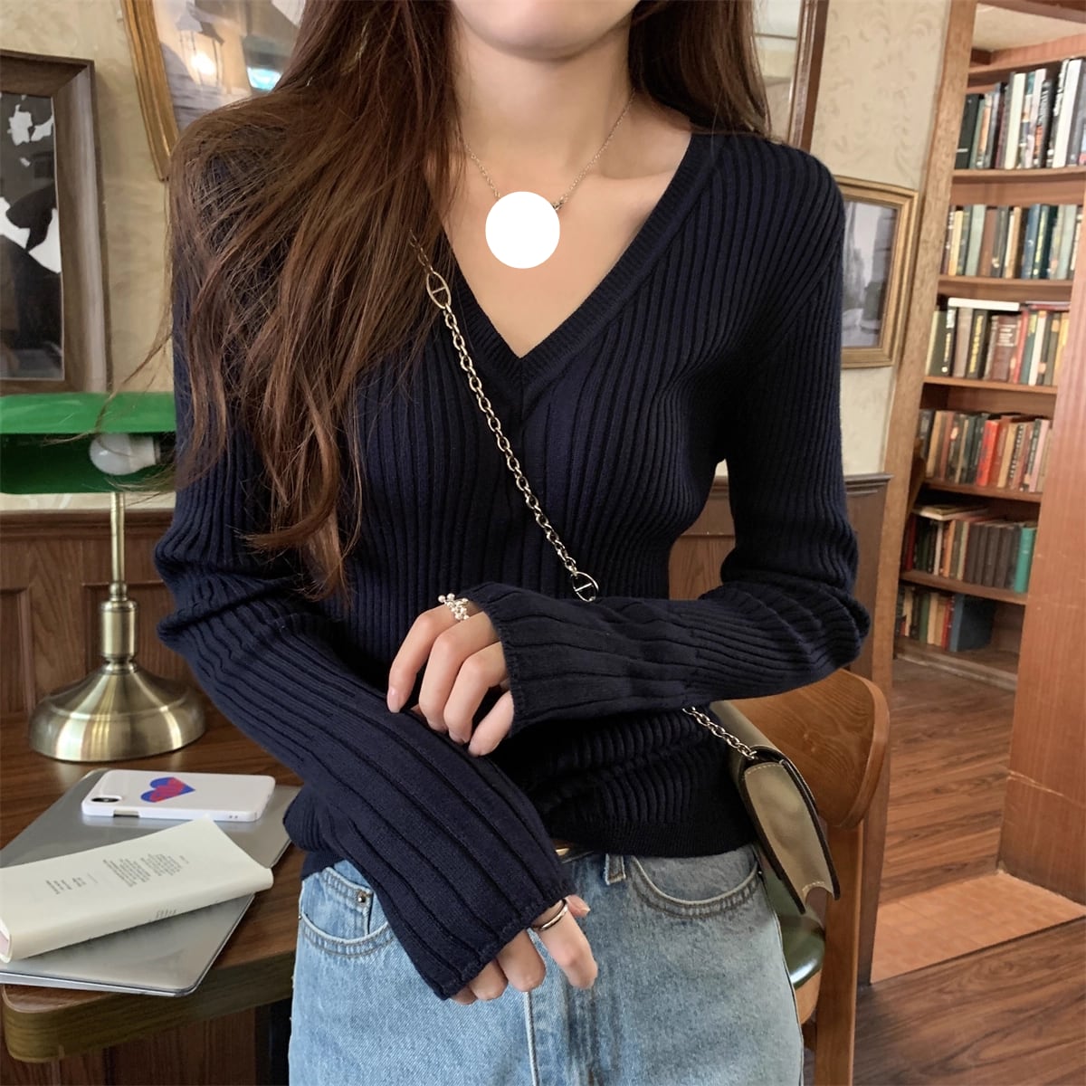 ザックリVネックのリブニットセーターです。