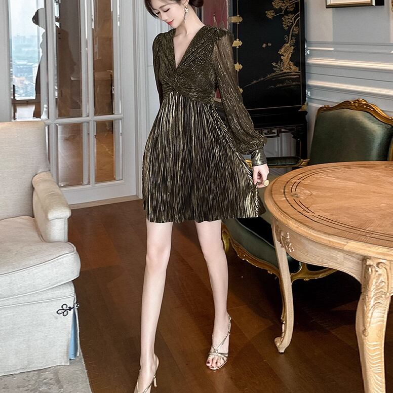 Aラインのフレアシルエットが動きに合わせて優雅に広がり、Vネックデザインがデコルテを美しく引き立てます♡