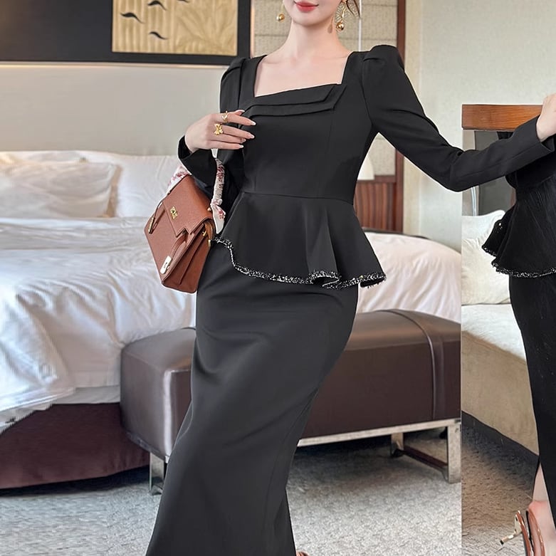ひざ丈のフリルとAラインのフレアシルエットが、女性らしさを引き立て、長袖のラウンドネックで抜群の着心地を実現しています♡