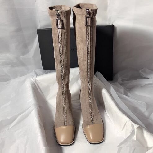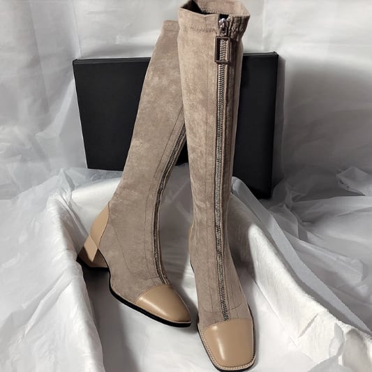 季節感あふれるレザーとスエードの異素材ドッキングロングブーツです。