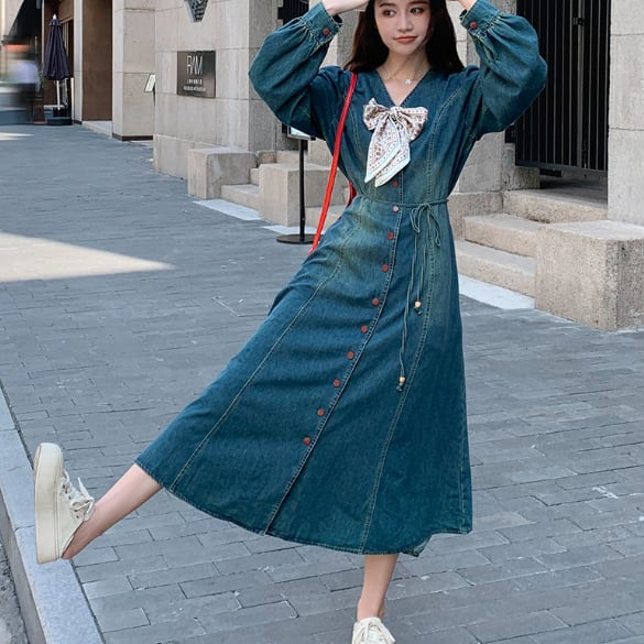 デニム生地のロングワンピースです
