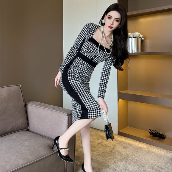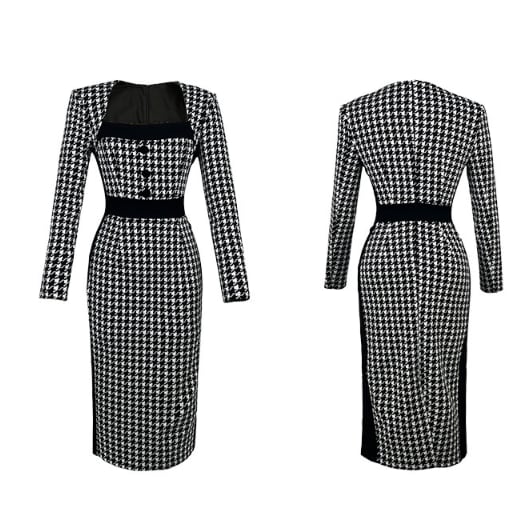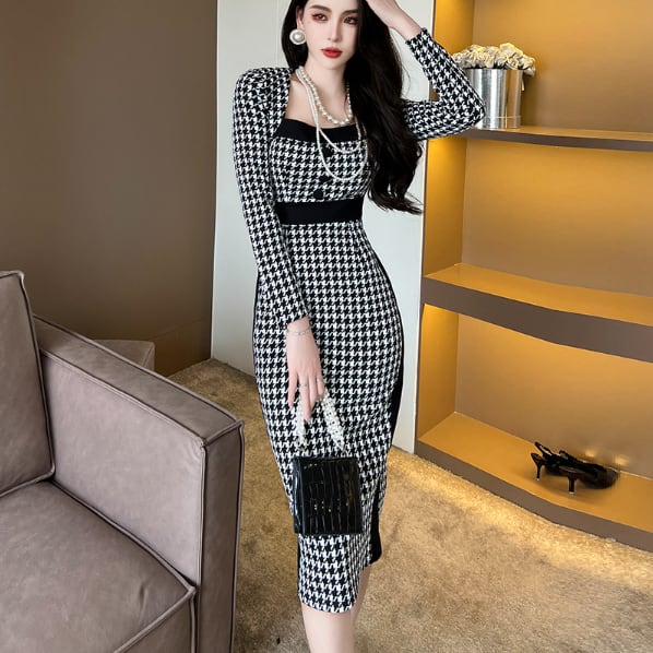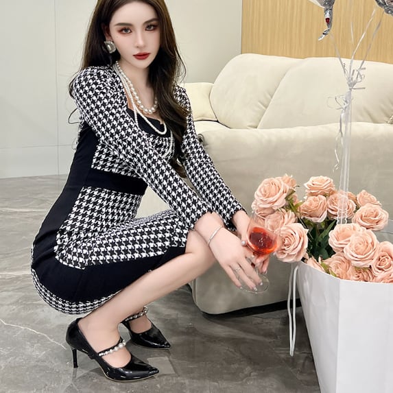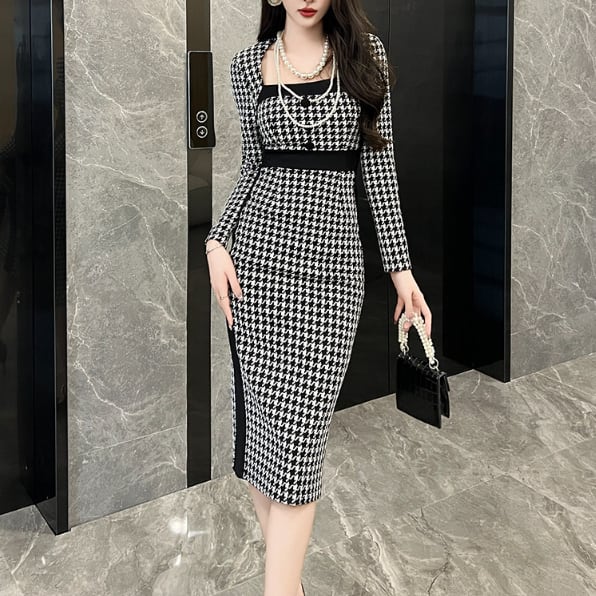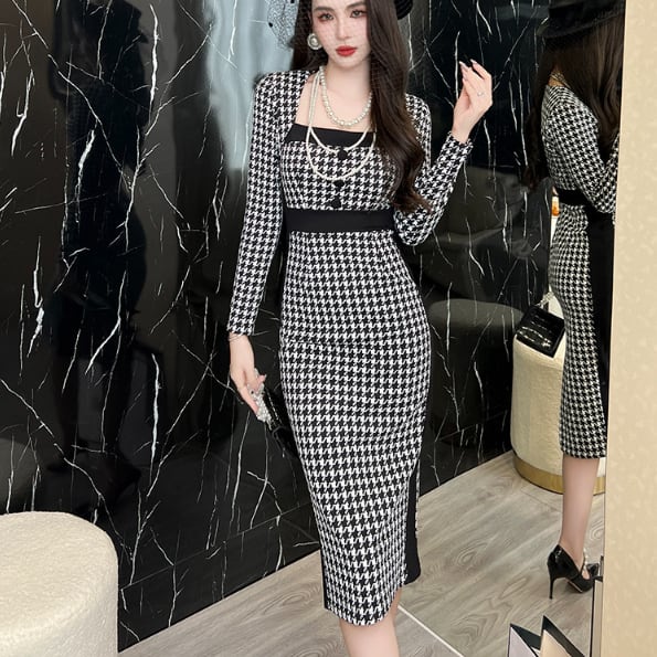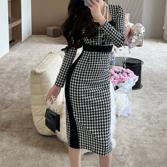千鳥格子柄のペンシルドレスです