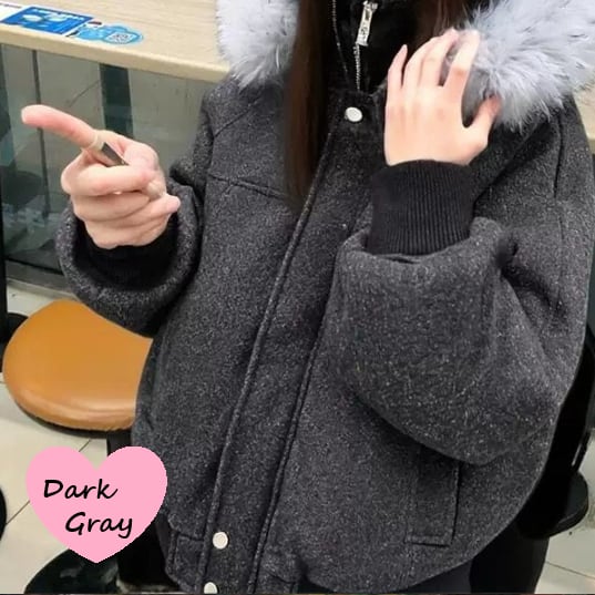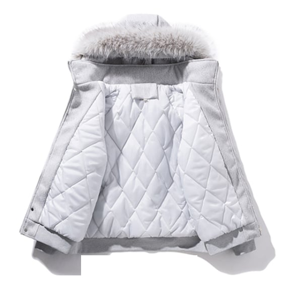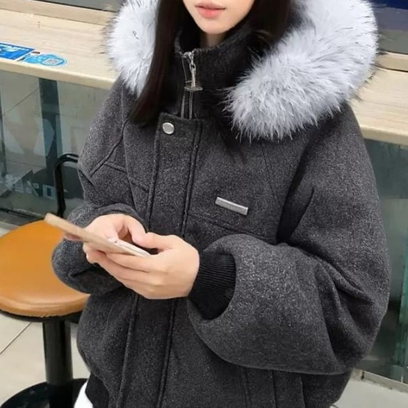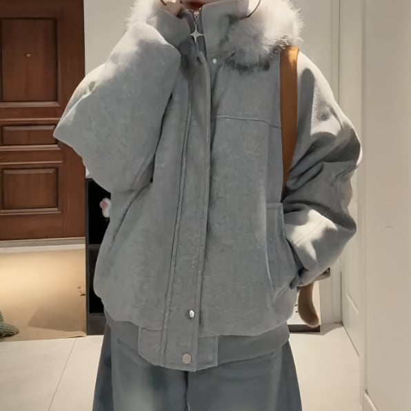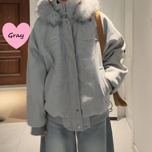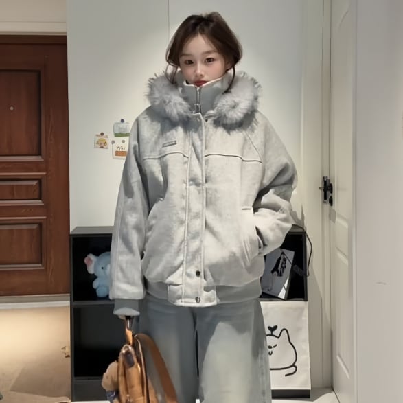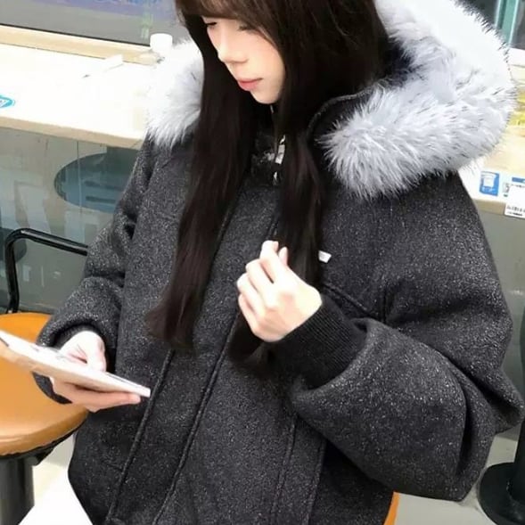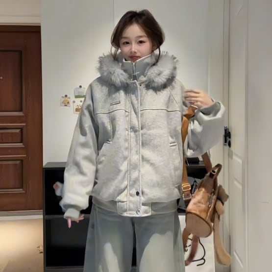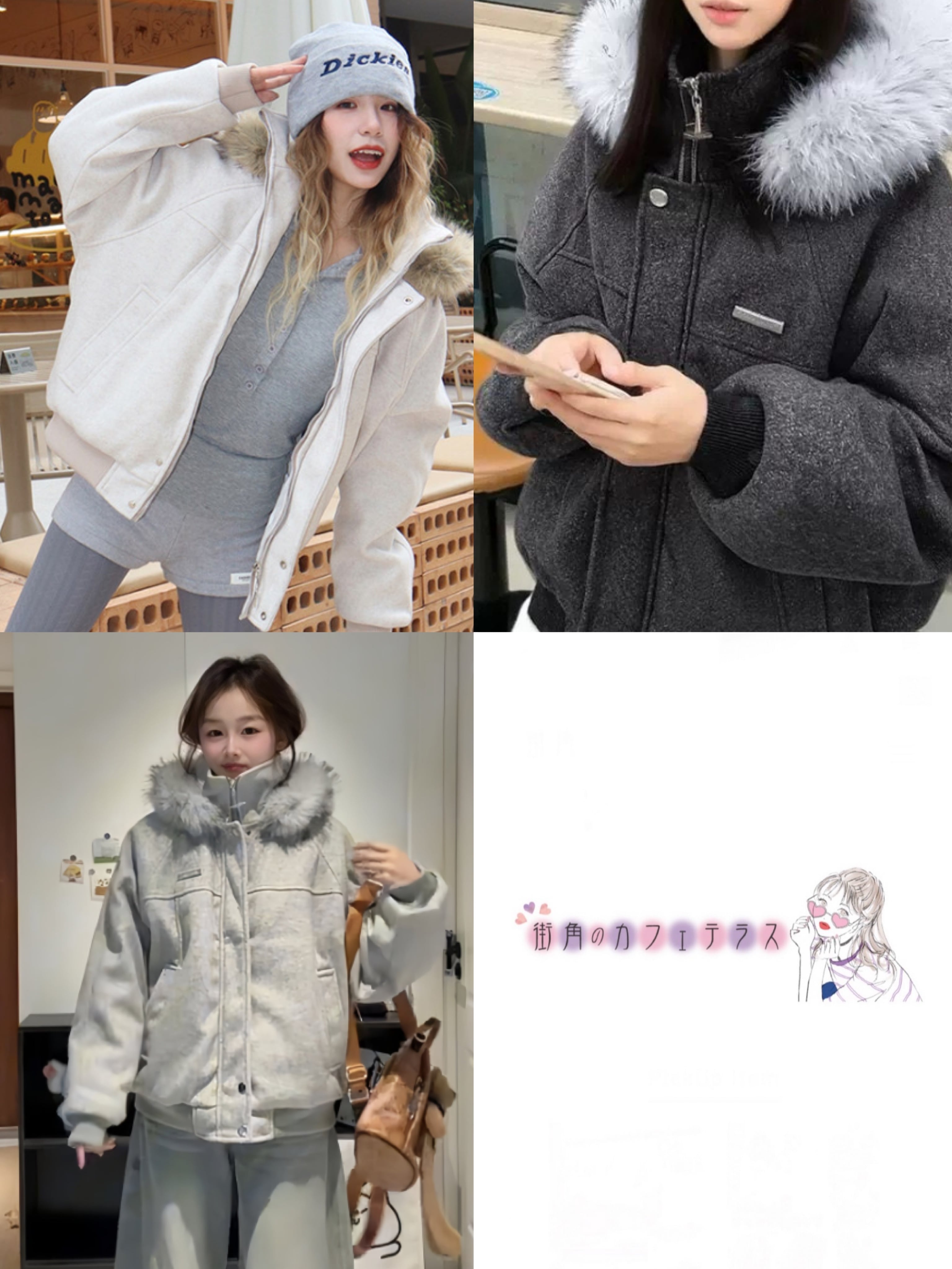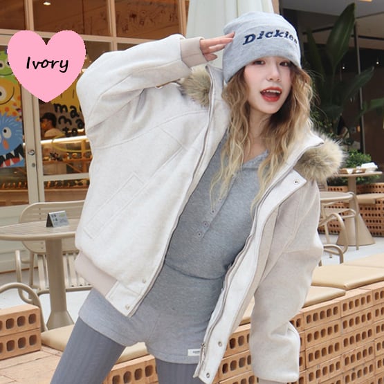 Vネックハイネックとふわふわのフード付きで、シンプルながらお洒落に決まる一着です。