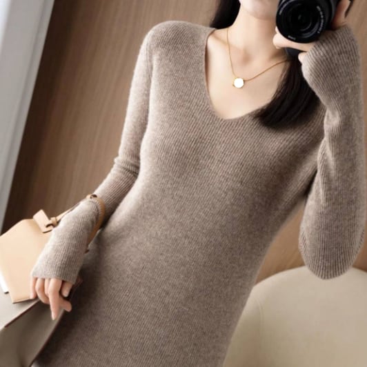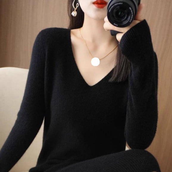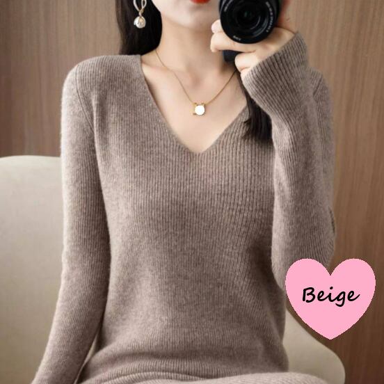 長袖のVネックデザインが女性らしさを引き立て、大人可愛い印象を与えます。