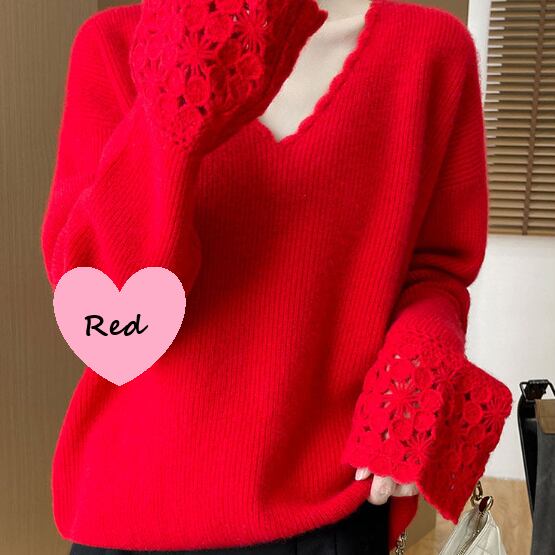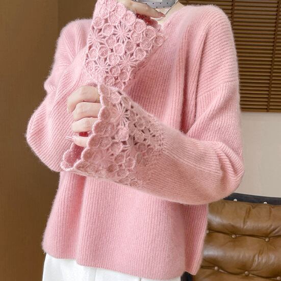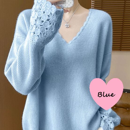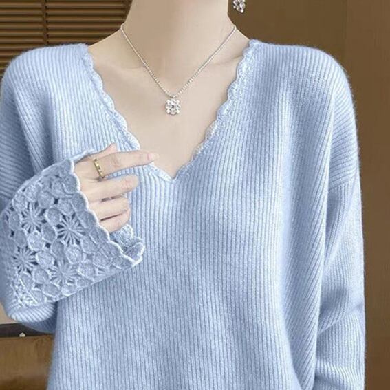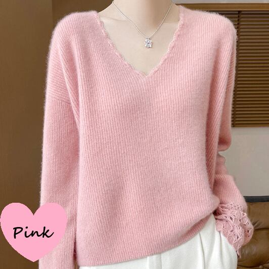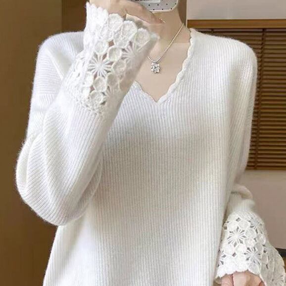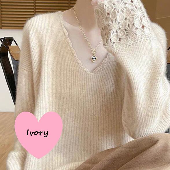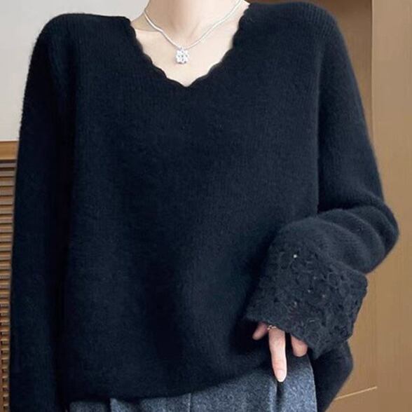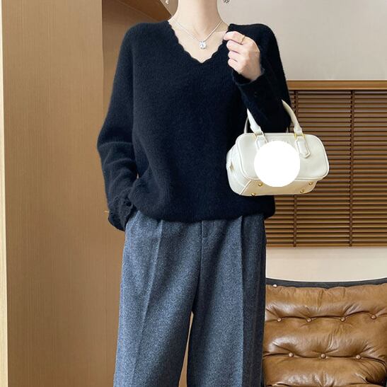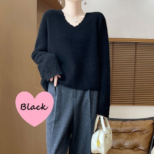 ザックリとしたVネックがシャープな印象を与えつつ、スカラップ風の装飾でレディな雰囲気もプラスしてくれます
