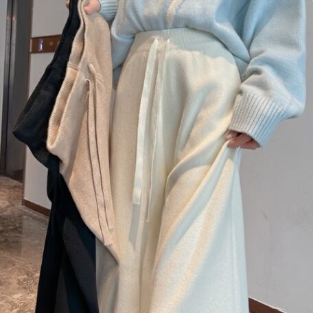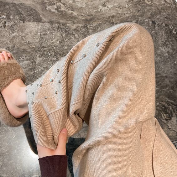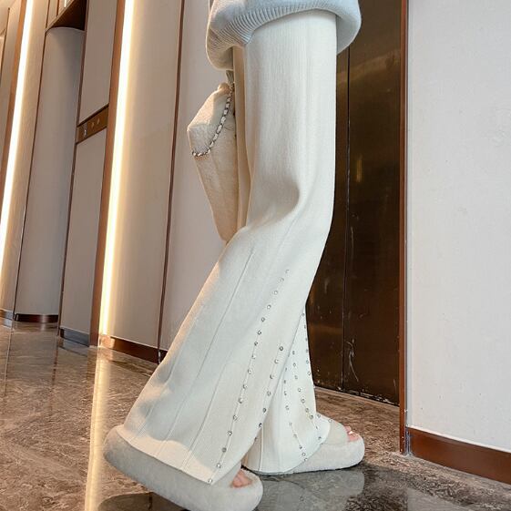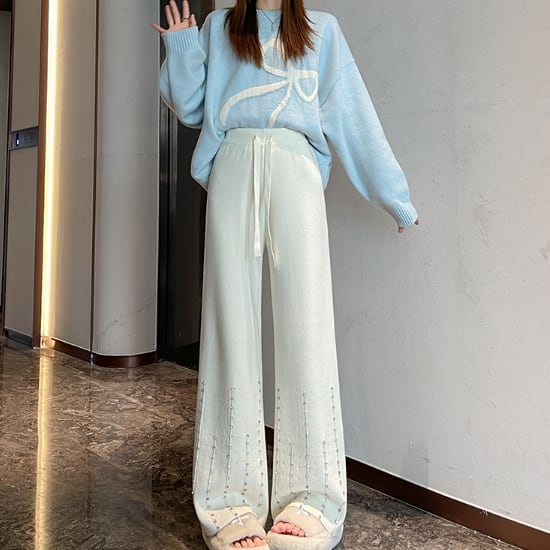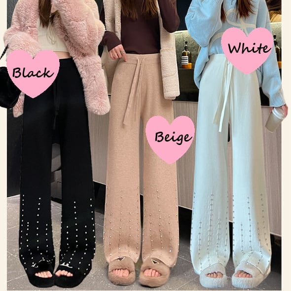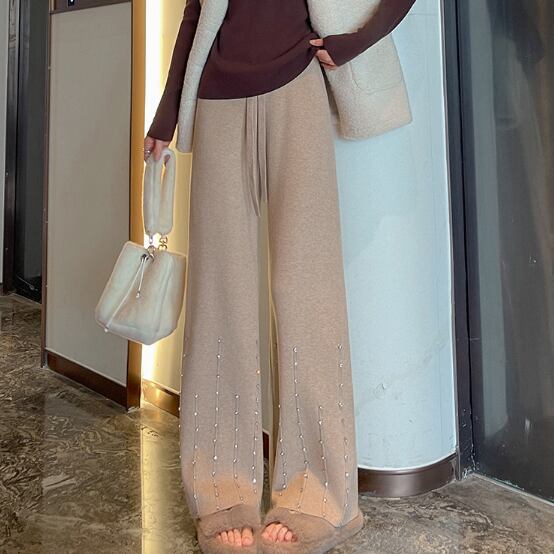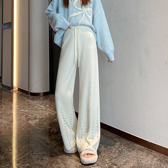 キラキラなビジュー装飾が目を引くリブニットパンツ