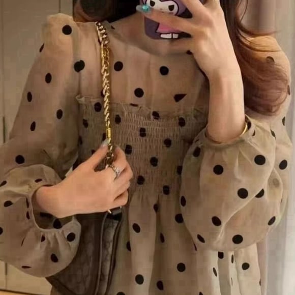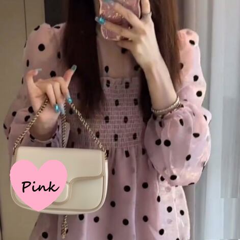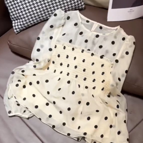 シンプルなAラインシルエットでありながら、ドット柄が可愛らしいアクセントに。