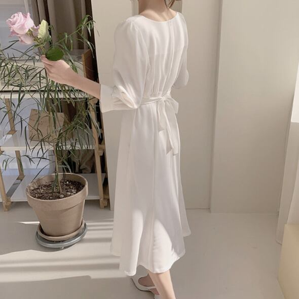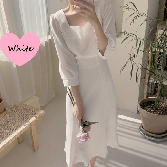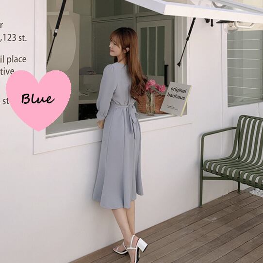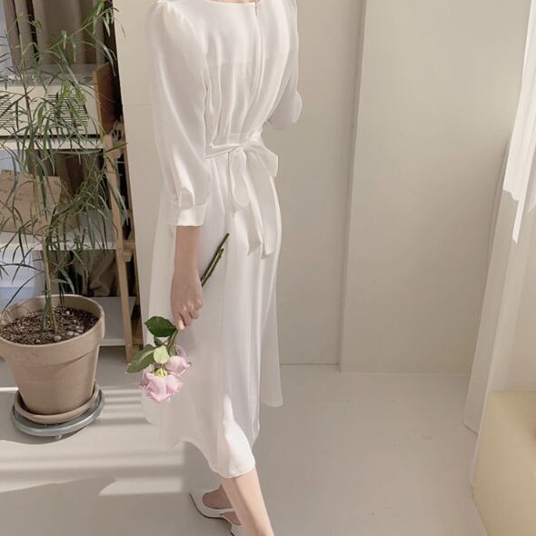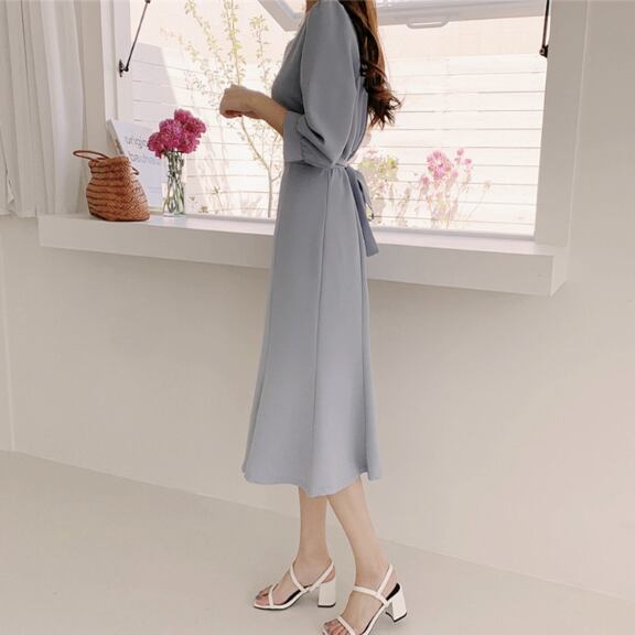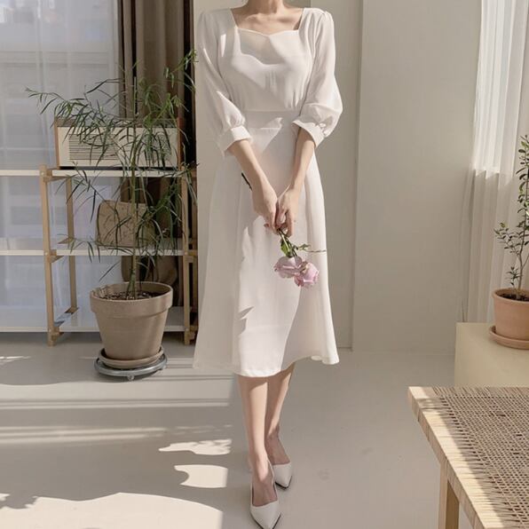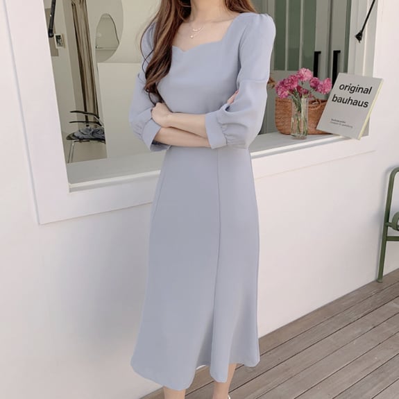 シンプルなデザインながらも、エレガントで可愛い印象を与えるミモレ丈のAラインフレアドレスです♪
