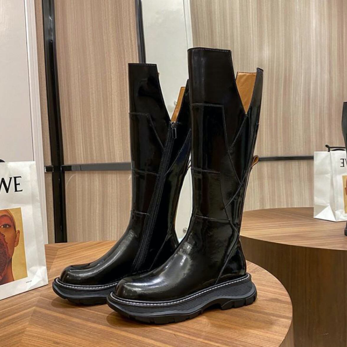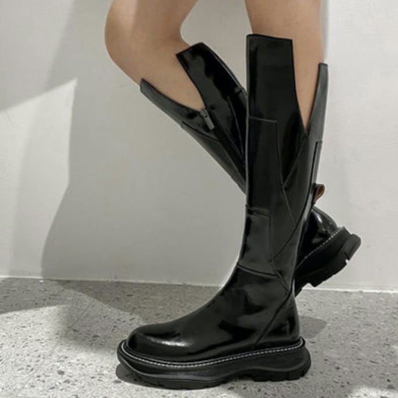 V字カットで美脚効果抜群のロングブーツ。