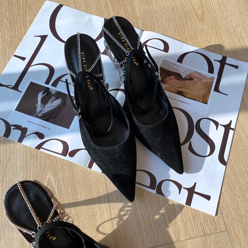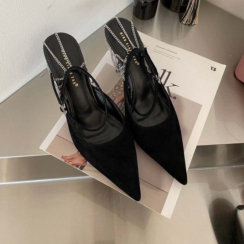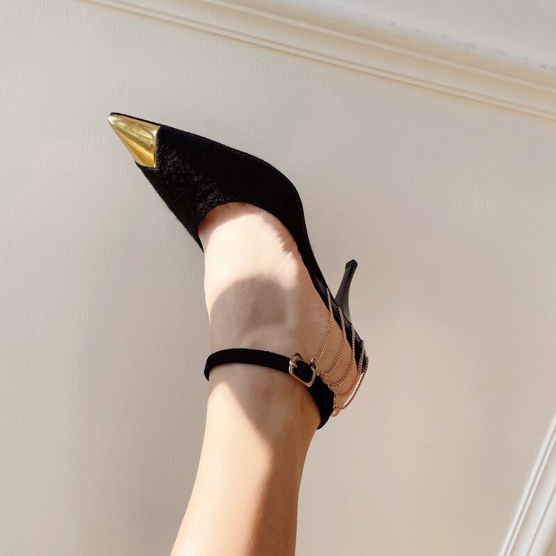 アンクルベルトからのチェーンデザインが目を引くポインテッドトゥのパンプス。