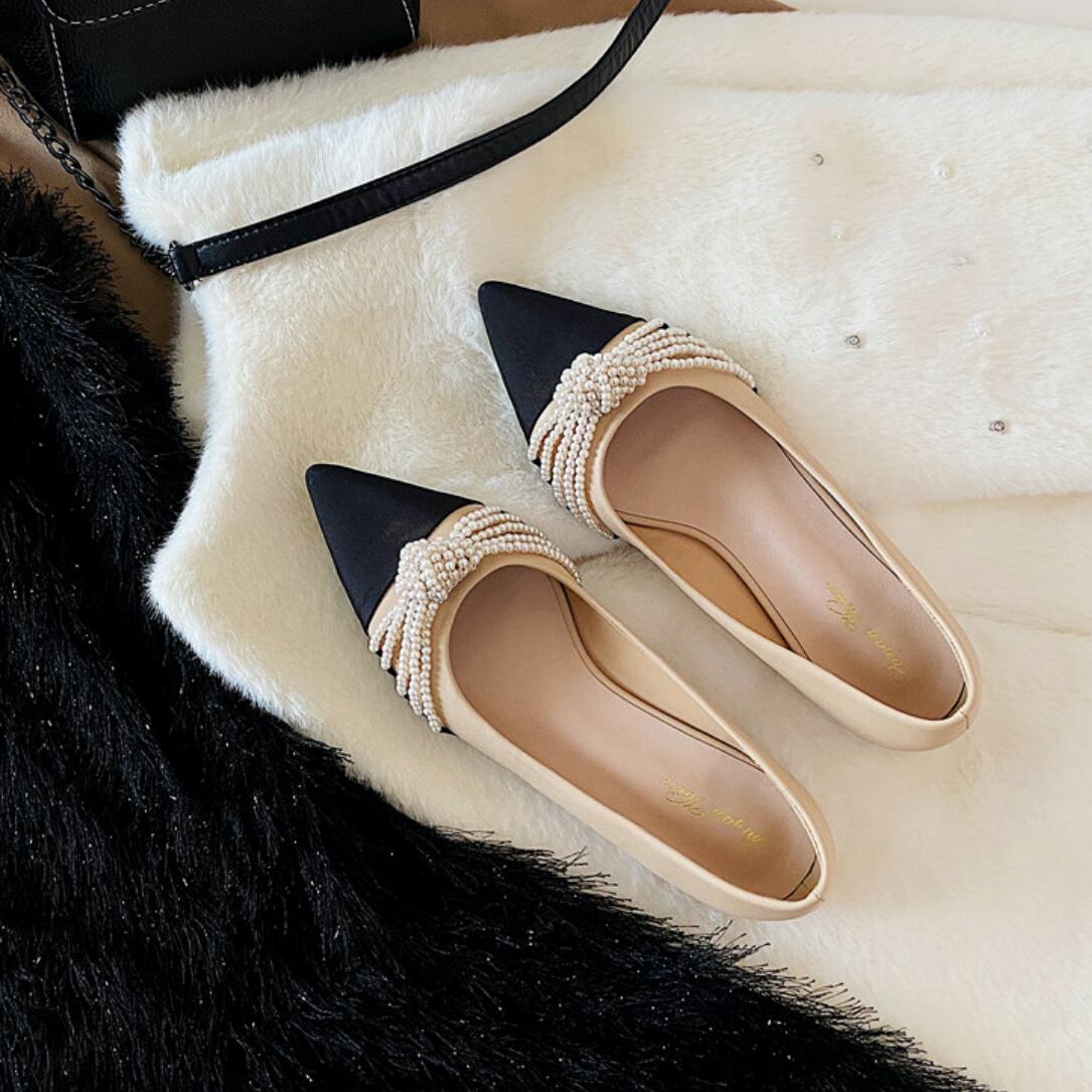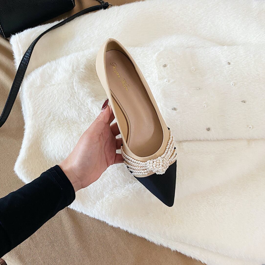 パール風ビジューが印象的なポインテッドトゥのフラットシューズ。