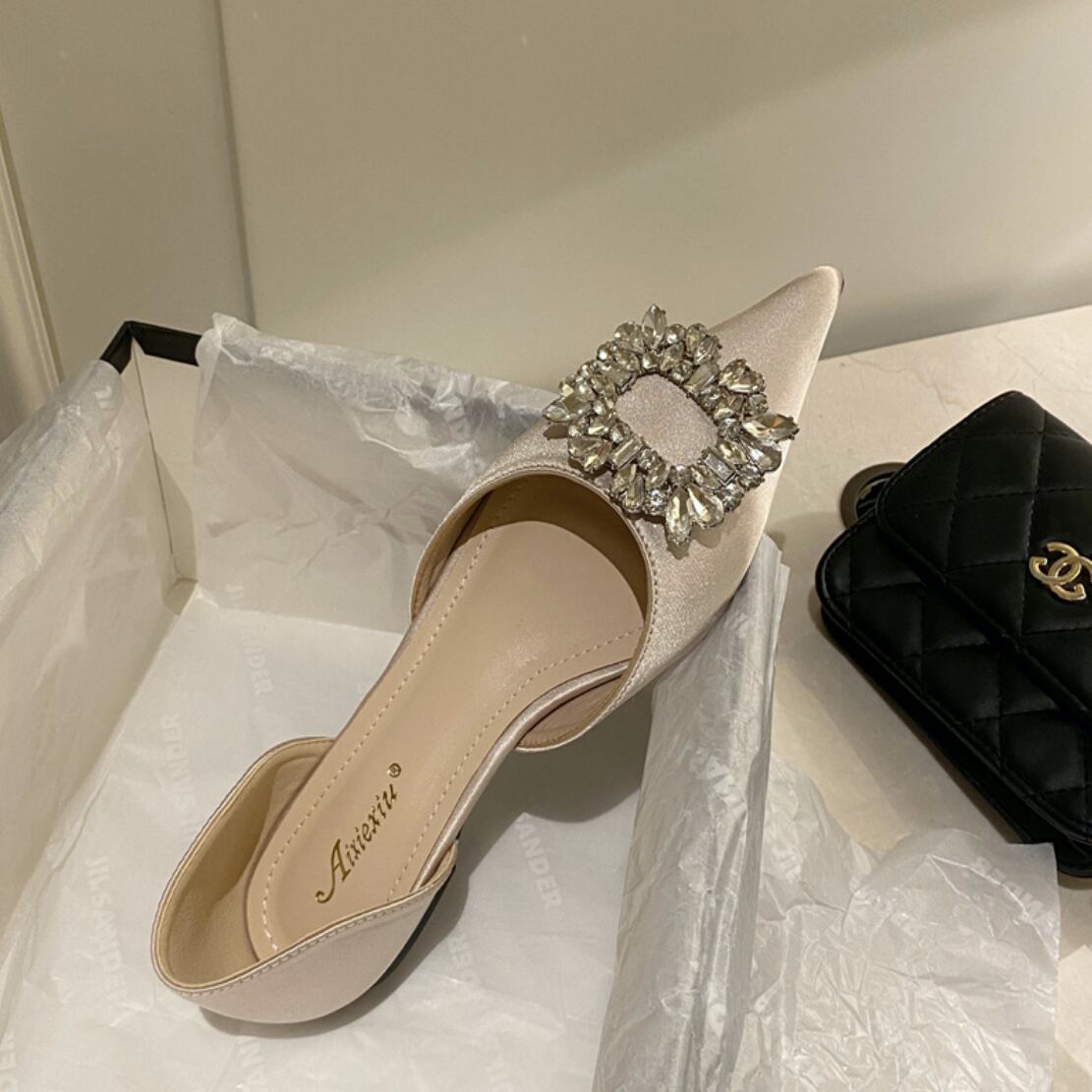 大きなスクエアのビジューが印象的なフラットシューズ。