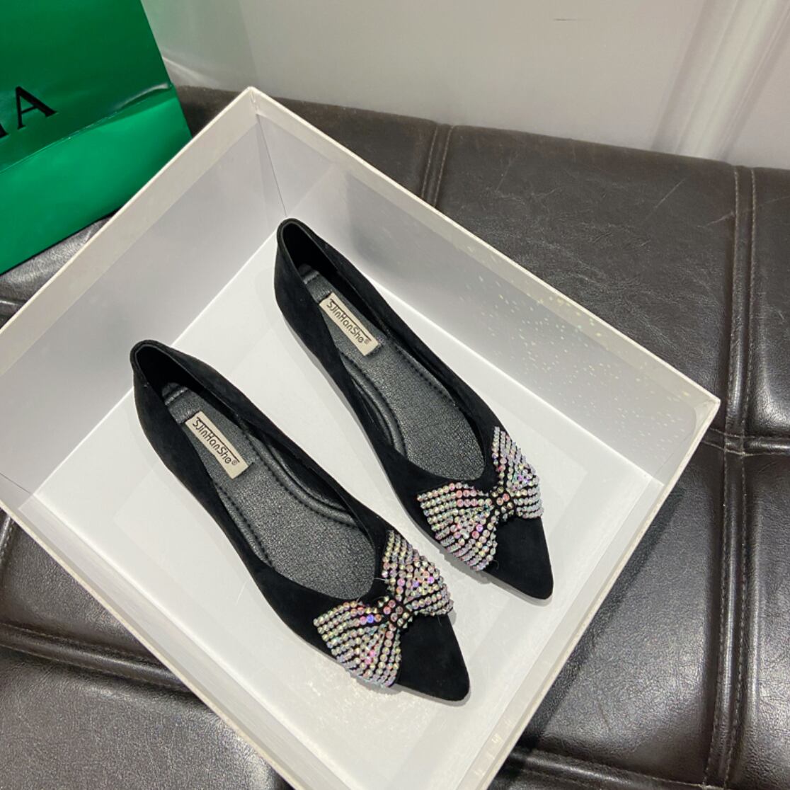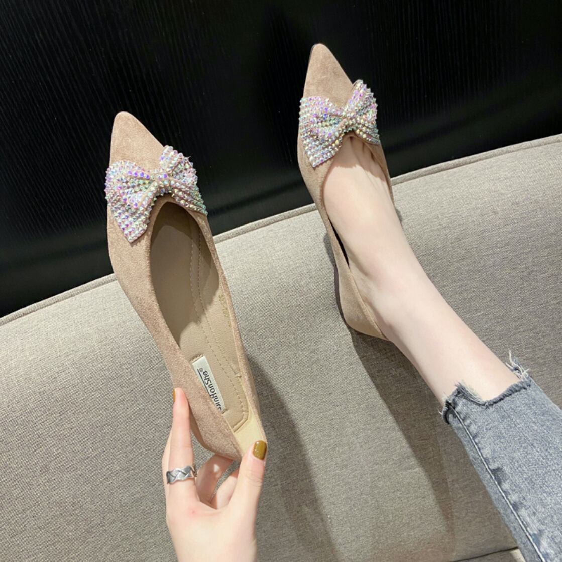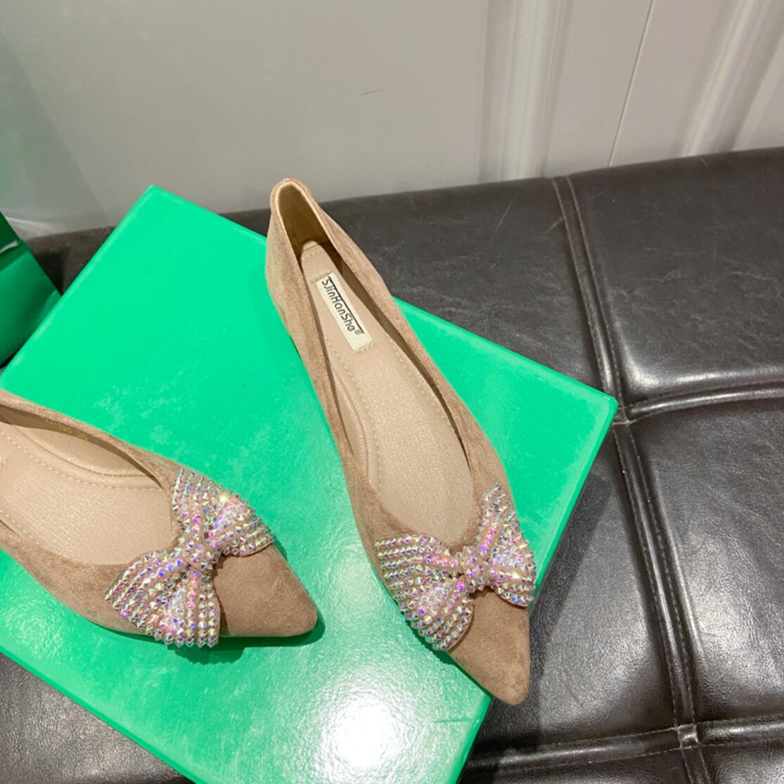 ラインストーンのリボンが可愛いフラットシューズ。
