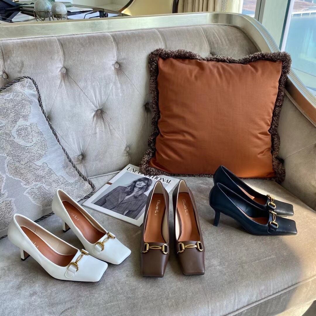 ゴールドのバックルが目を引くスクエアトゥのパンプス。
