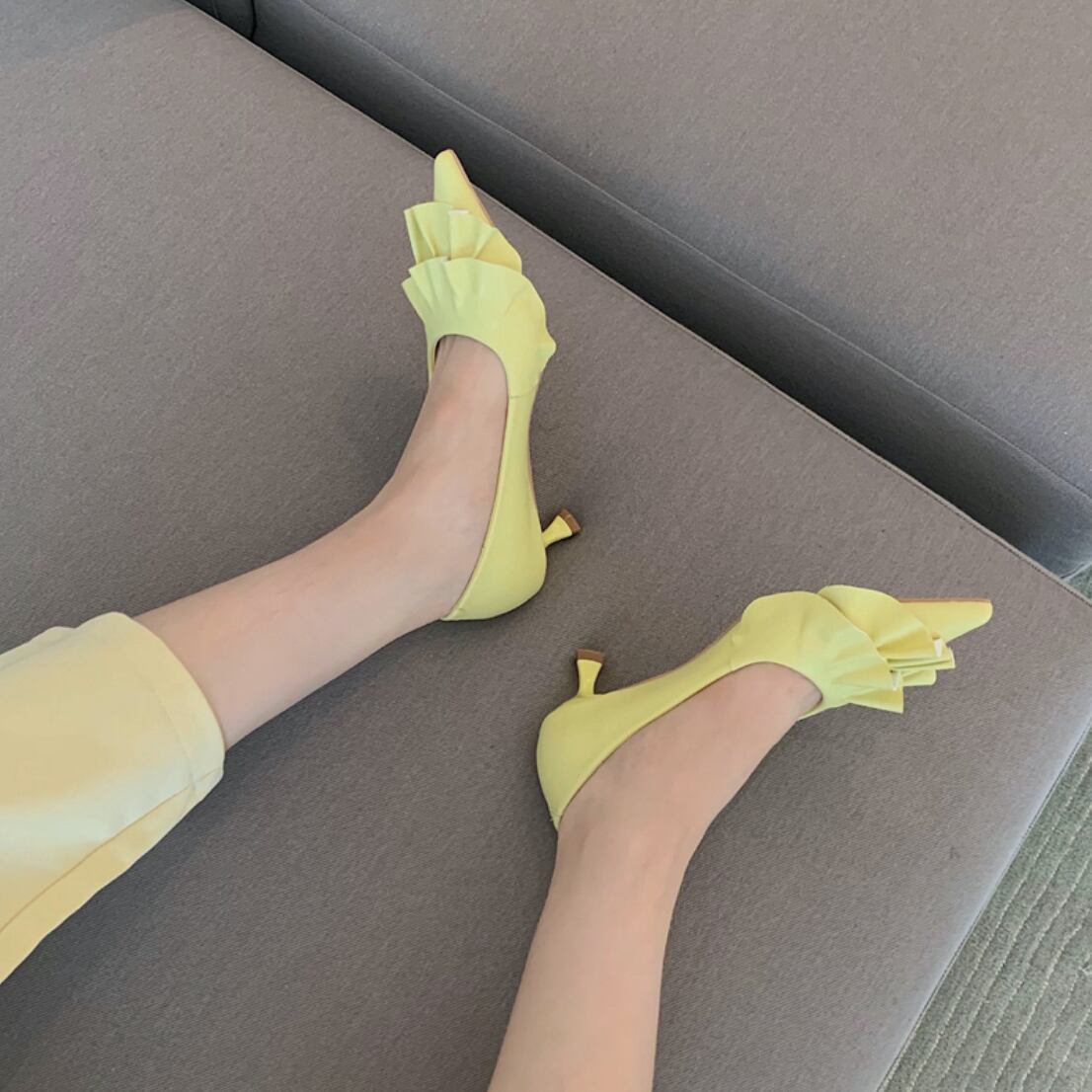 フリルデザインが可愛らしいポインテッドトゥパンプス。