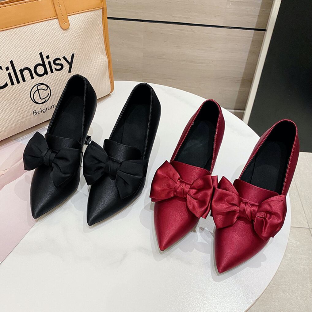 大きなリボンモチーフが可愛らしいポインテッドトゥパンプス。