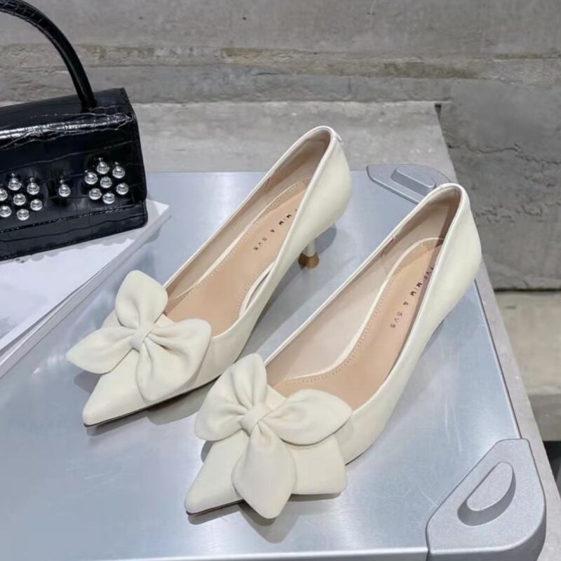 無地のシンプルデザインにリボンが大人可愛いパンプスです。
