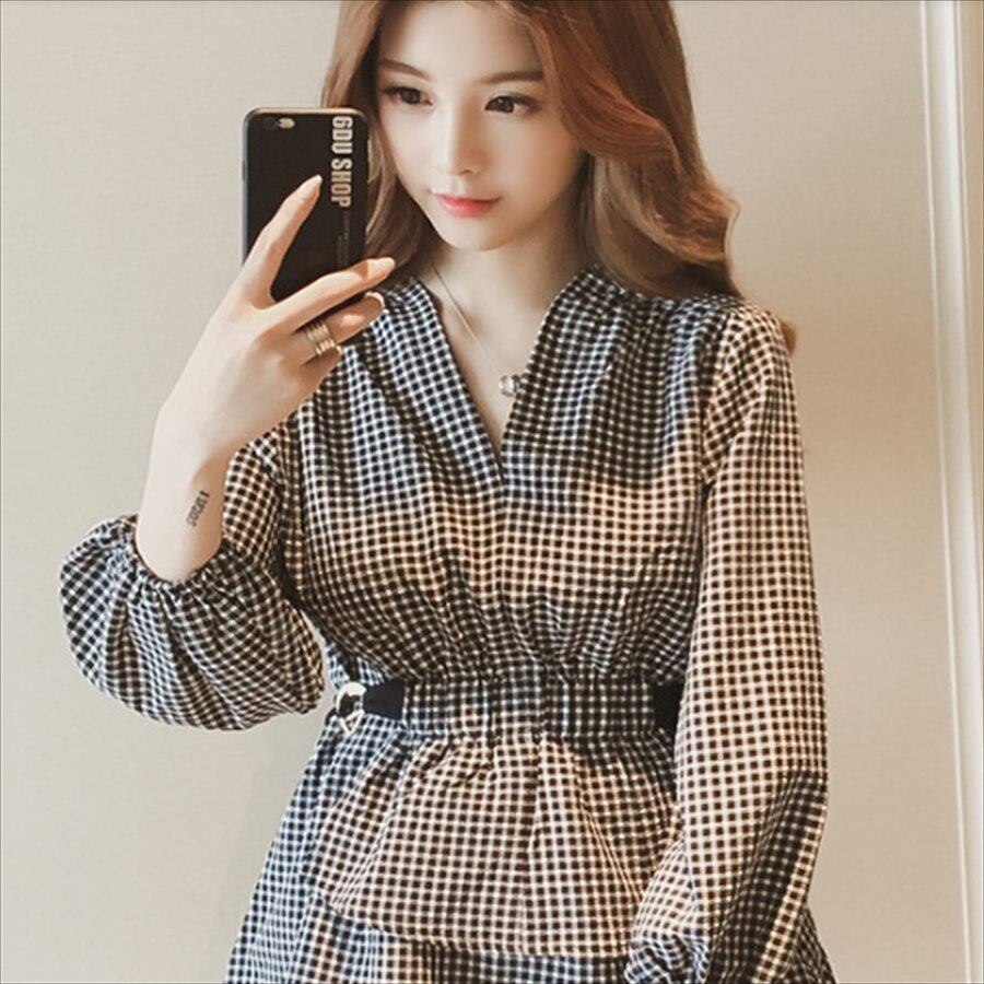 チェック柄の長袖ブラウス♡
