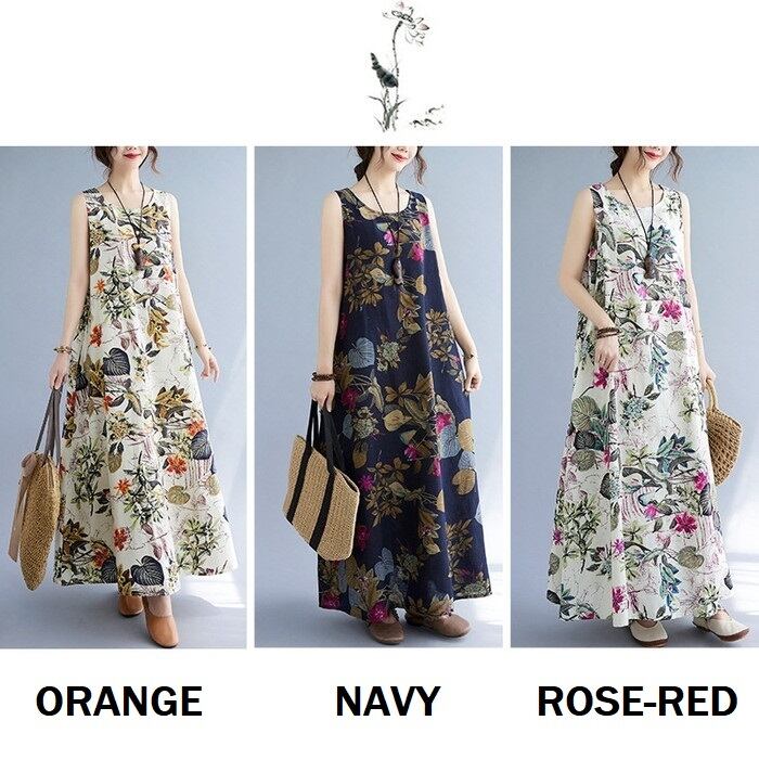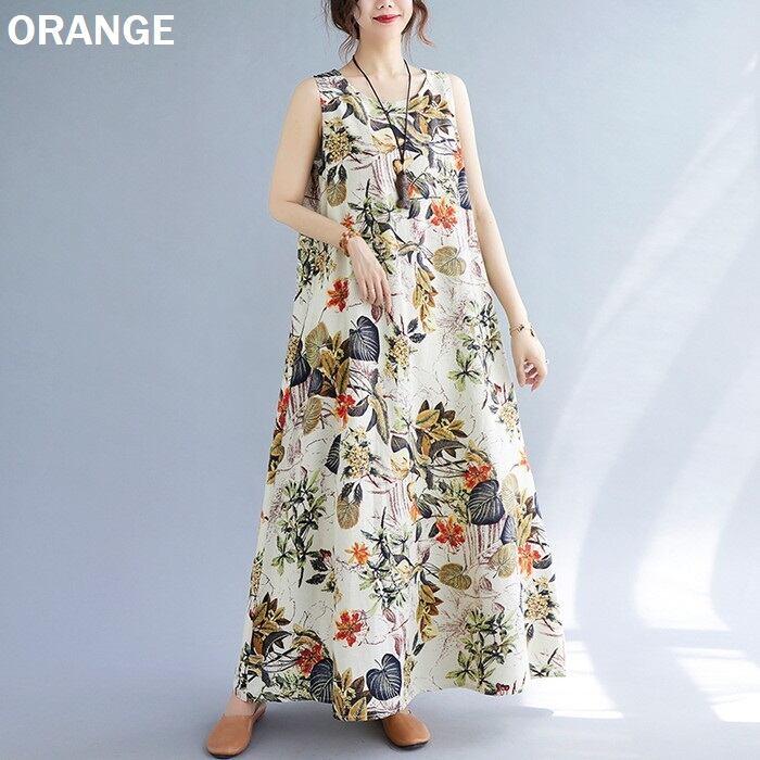 花柄プリントが印象的なノースリーブワンピース。