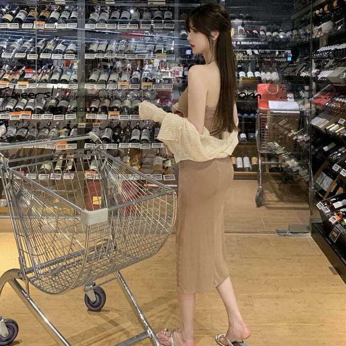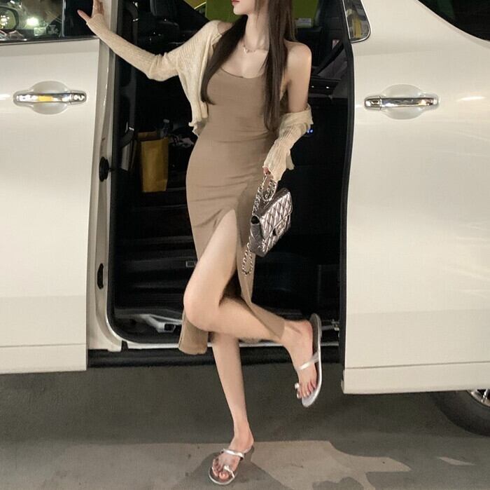クロップドカーデ×キャミワンピのセットアイテム。