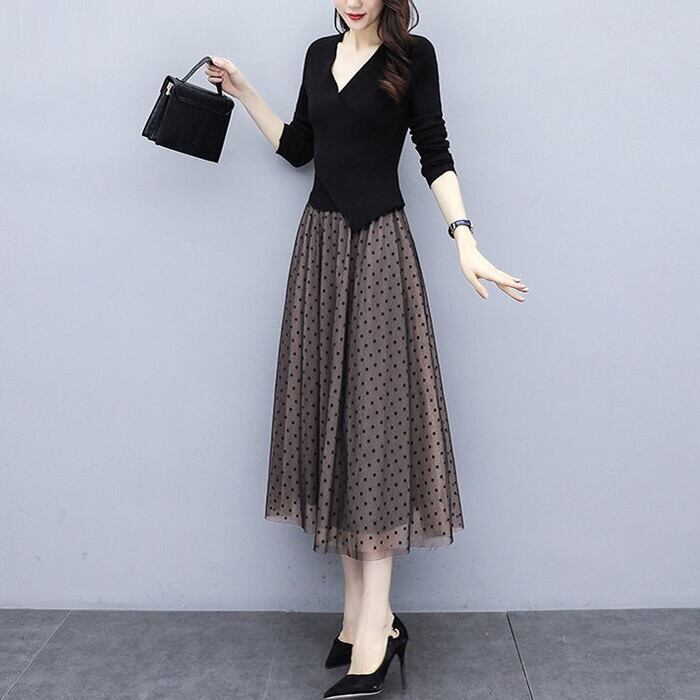 キュートになりがちなドット柄も長めの丈感と