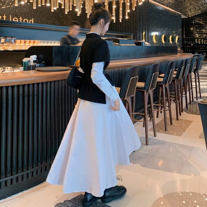 シャツワンピース×ニットベストのセットアイテム。