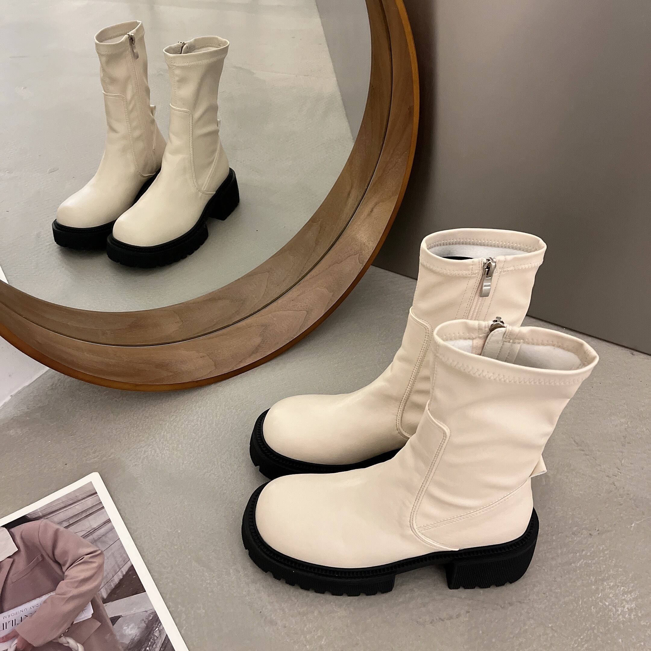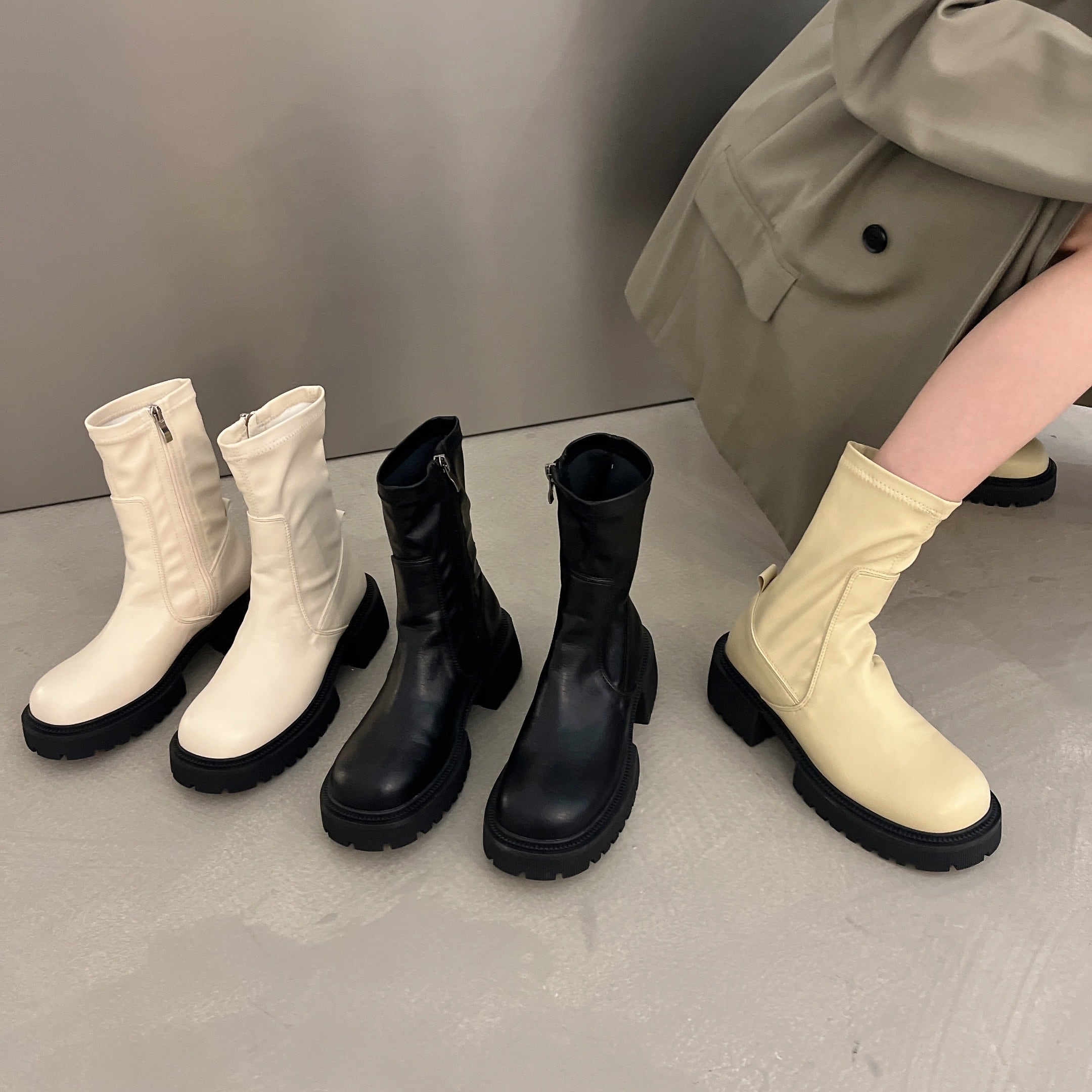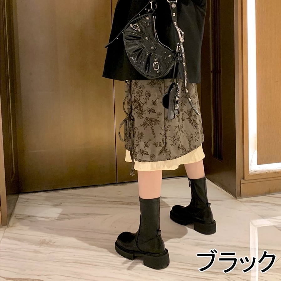 サイドにジッパーが付いたシンプルデザインのショートブーツ。