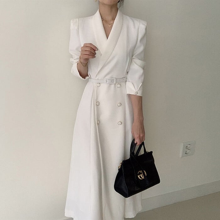 フロントのダブルボタンと、すらりと縦のラインを強調する