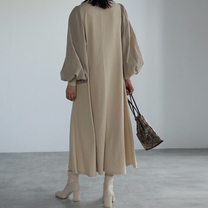 ぽわんと可愛らしいボリューム袖がポイントのロングワンピース。