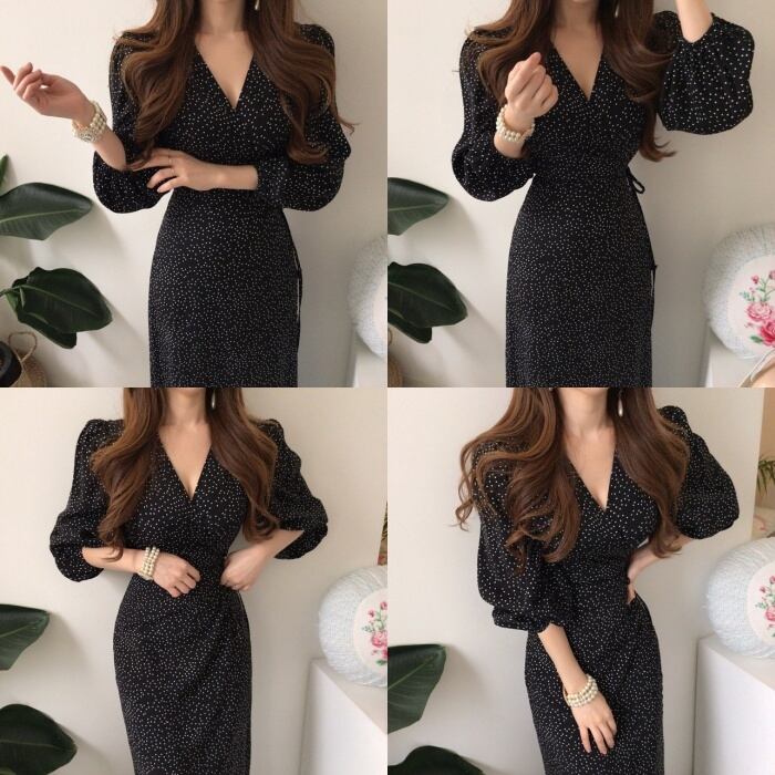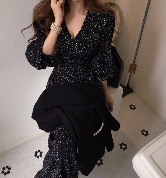 小さなドット柄で甘くなり過ぎないロングワンピース。