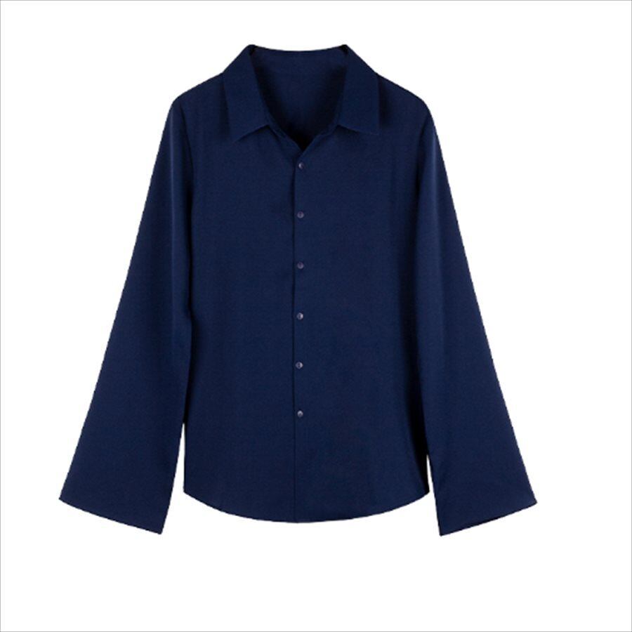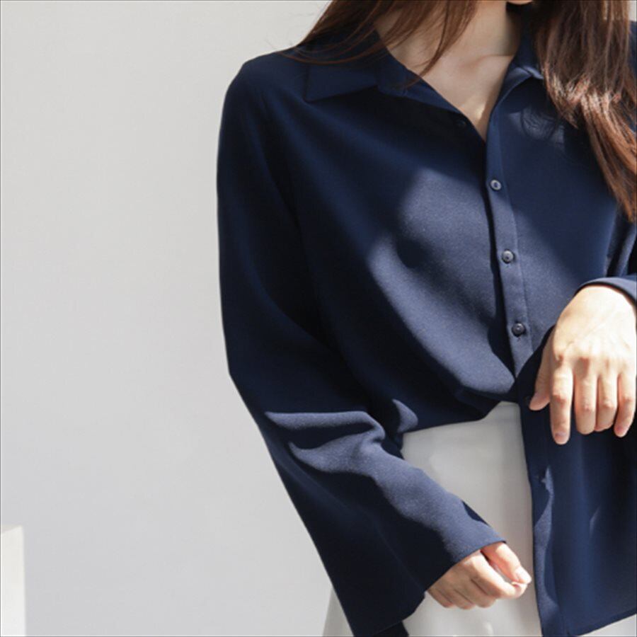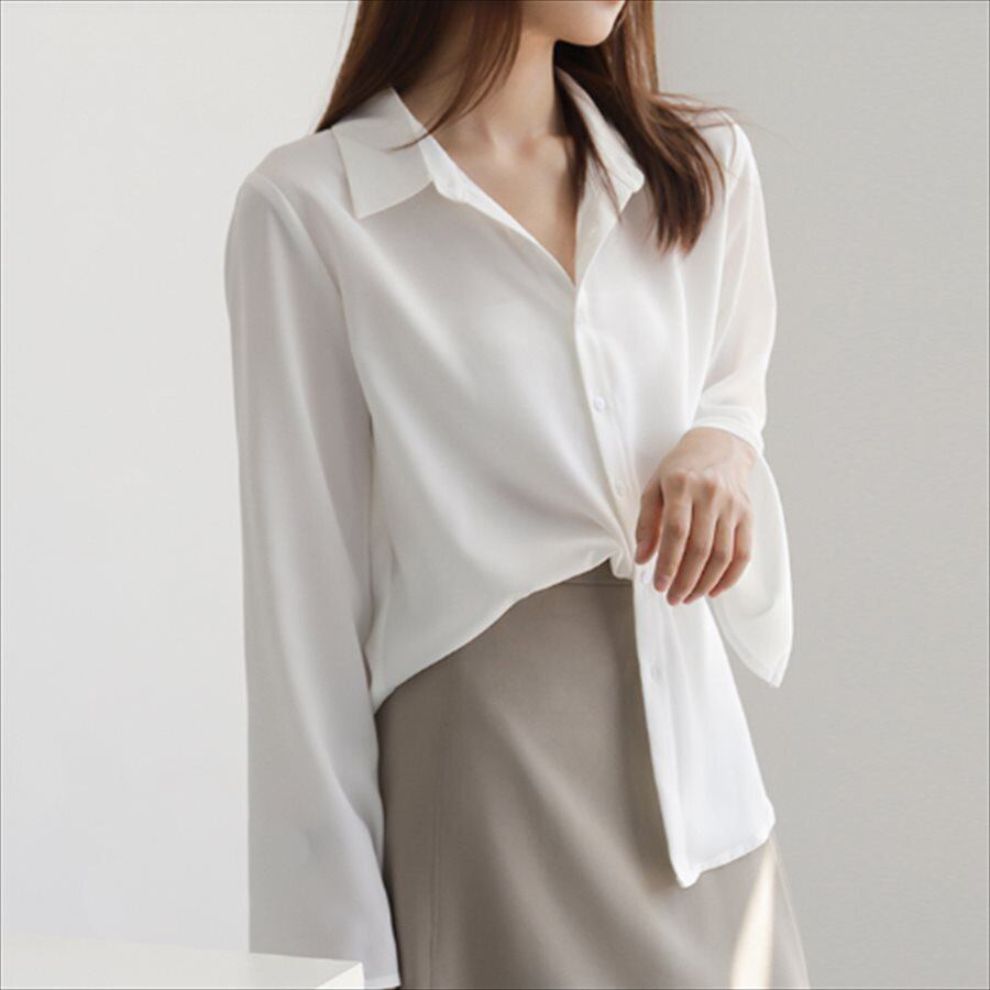 フレアスリーブの長袖ブラウス。