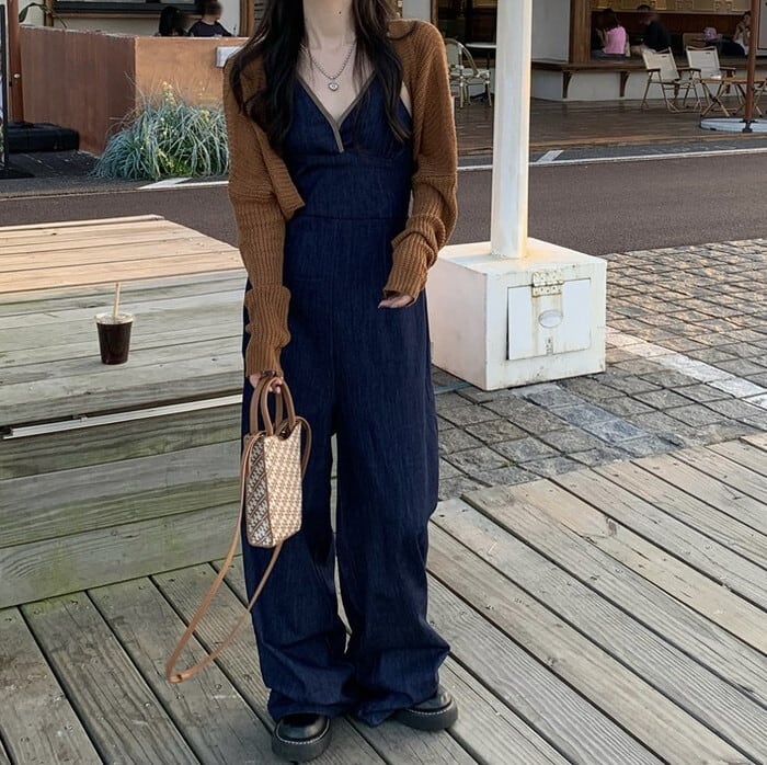 華奢なストラップとVネック、カーディガンの色と合わせた