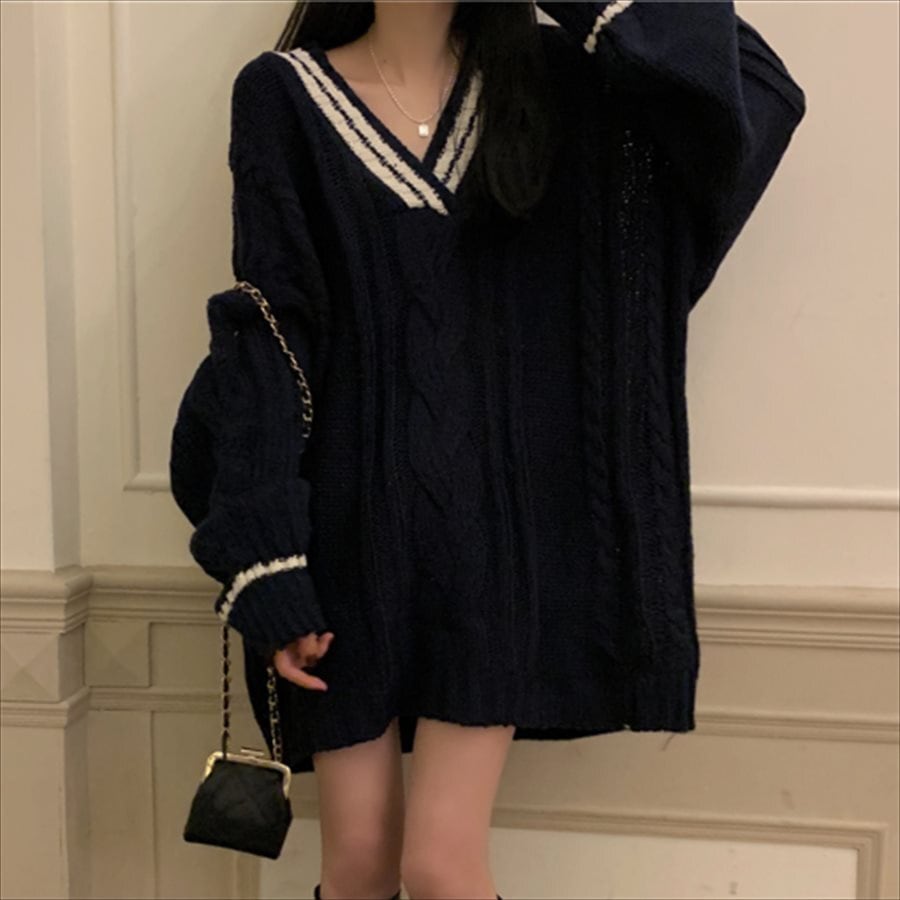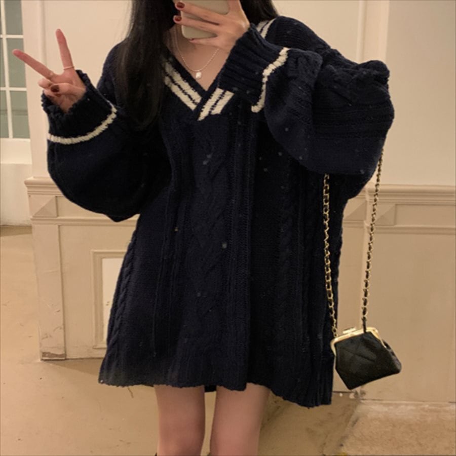 バイカラーデザインのかぎ編みニットセーター。