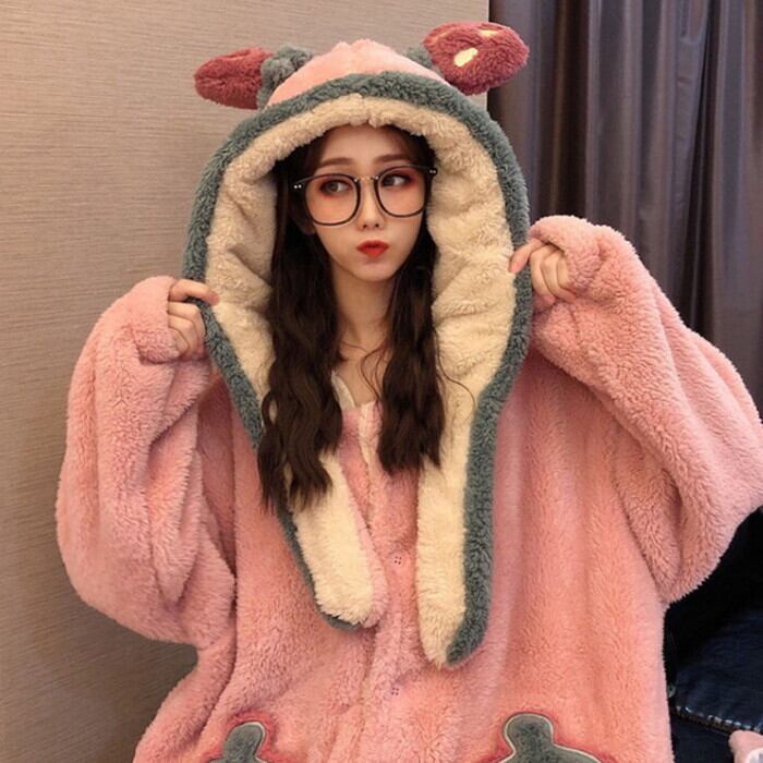 フードにはキュートな耳付き、甘いイチゴモチーフで気分も高まります。
