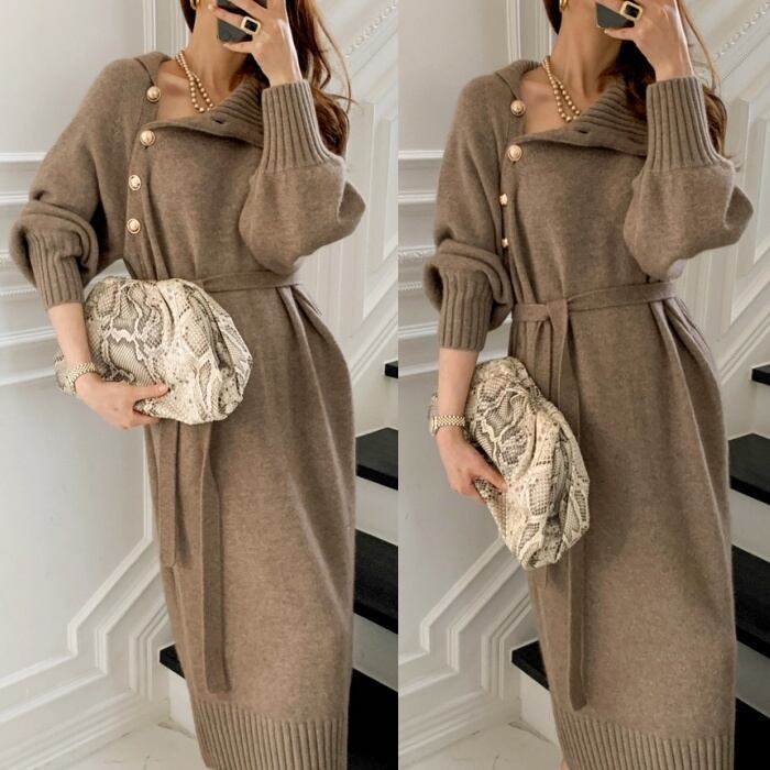 大きめのボタンが華やかさをプラスするニットワンピース。