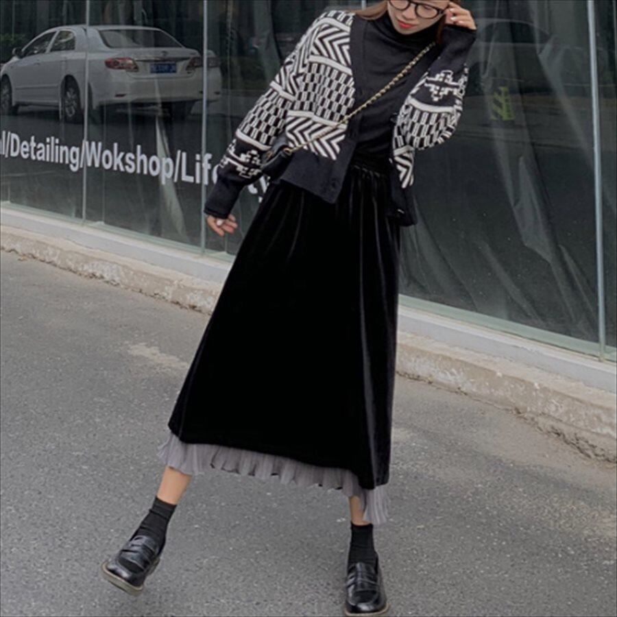 マキシ丈のベロアスカート。