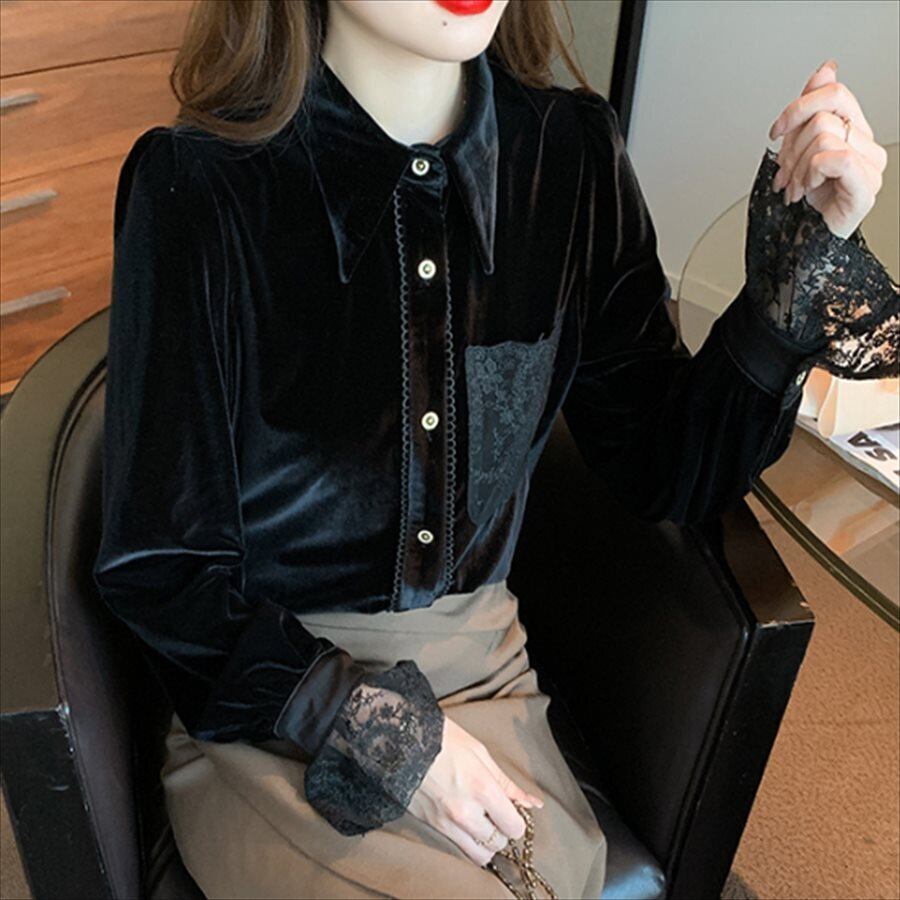 ベロア生地の長袖ブラウス。