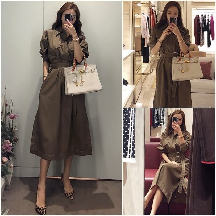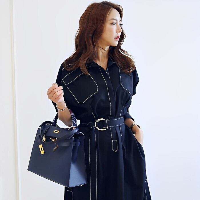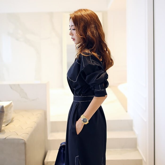 ベルト付き◎ステッチノーカラーロングシャツワンピース・2色