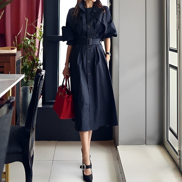 長めの丈、シックなネイビーカラーで上品に決まります。