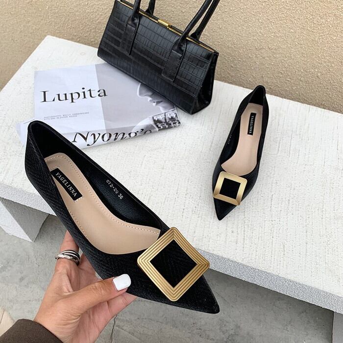 ゴールドカラーのスクエアバックルをあしらったパンプス。