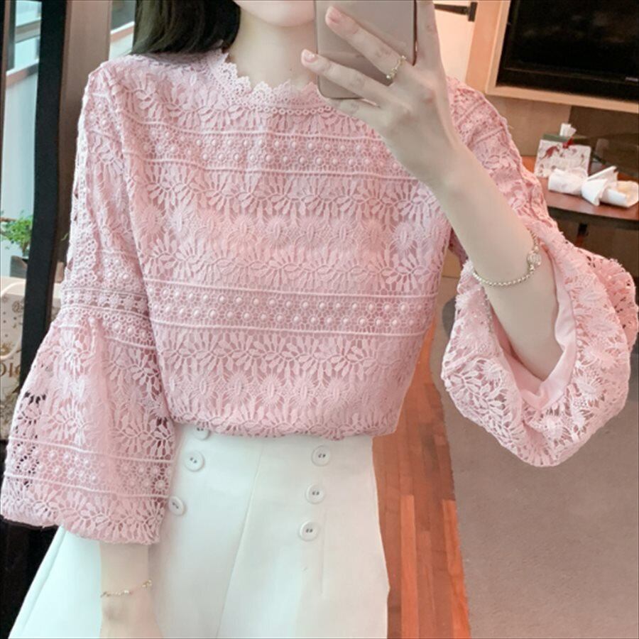 フレアスリーブのレースブラウス。
